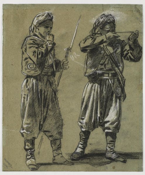 Editor: Here we have Victor Adam's "Child Staring Up at a Man," dating sometime between 1820 and 1866. It’s a drawing, using pencil and print media, and the composition has a kind of whimsical charm with its octagonal frame. I'm immediately drawn to the lines in the boy's shirt and breeches. How would you interpret this piece from a formal perspective? Curator: The very qualities you note are pertinent. The linear precision of the pencil work creates distinct forms and textures. Observe the stark contrast in the rendering of the child's striped clothing compared to the more broadly shaded coat of the man. How does this difference in technique influence your perception of their respective importance in the composition? Editor: I see that it makes the boy "pop" a bit more because the pattern contrasts so strongly with everything around him, but the man seems bigger because he's physically bigger in the image. Curator: Indeed. And what of the man's gaze, directed upwards and away? It is contrasted by the implied relationship between them. Notice how the composition guides our eye—from the solid form of the cylindrical post on the left to the child, and ultimately ascending with the man's sight line. Editor: It feels like a deliberate journey for the viewer. The positioning is everything. Curator: Precisely. This orchestrated visual progression emphasizes not just what is depicted, but how it is perceived through formal means, such as the deliberate arrangements of forms, lines, and the use of contrast to affect your viewing experience. These techniques subtly influence emotional and intellectual engagement with the artwork. Do you agree with my reasoning? Editor: Definitely, I hadn’t really considered how the forms interacted and influenced where I look. It makes a lot of sense! Curator: It highlights the potent capability for art to communicate not necessarily *through* what it represents, but through how its arrangement prompts different observations and interpretations. Editor: I’ll be sure to remember that when thinking about artworks from now on.