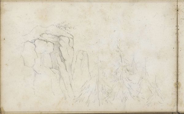 Curator: Here we have "Liefdespaar en een gezelschap in een landschap" by Charles Rochussen, dating from about 1840 to 1860. It's a drawing done in pencil and ink and currently residing at the Rijksmuseum. Editor: Immediately, I'm struck by the contrast—or lack thereof—between the detailed foreground and the almost ghostly background scene. It feels like two separate worlds, almost like two distinct emotional states laid side-by-side on a single piece of paper. Curator: That contrast is interesting. The clear, precise lines of the couple, their physical interaction so clearly defined by Rochussen's confident strokes, versus the more ephemeral rendering of the landscape with its figures. One is fully realized, tangible, the other fading, suggesting impermanence perhaps. Rochussen might be playing with the very idea of tangible versus intangible. Editor: Yes, and what do the symbols whisper here? A love pairing front and center, suggesting perhaps intimacy, strong human bonds, as juxtaposed with a society, rendered as mere apparitions? Are we considering a world where love supersedes social ties or perhaps how relationships form, live, and sometimes…fade like memories. Curator: Or, considered through a more materialist lens, is Rochussen reflecting on the societal structures that dictated such couplings? Think about the role of courtship, the economics of marriage in that era... these very "apparitions" might signify the broader societal pressures acting on that central, 'solid' relationship. Was the drawing meant as an exercise in capturing the constraints, through labour intensive drawings like this? Editor: Interesting idea. I look at the figures under the trees and there is a sort of quiet serenity. One can interpret these background figures in numerous ways. To me, these individuals serve as a looking glass reflecting love as a moment, contrasted to communal presence as a whole – a shared narrative. Love as a passing emotion, experienced uniquely. And in due course – that sensation then dissipates, becomes one thread amongst the web of memories, culture and social interactions. Curator: So it could be a piece grappling with not just emotion, but its material manifestation through social practice, its impact on communal narratives as expressed with a dog casually laying next to them. All considered together using pencil and ink, mediums accessible yet demanding craft. Perhaps the intent lies within illustrating the complexities, impermanence, yet inherent social structure and roles within Dutch Society? Editor: I hadn't considered it from that angle! It's remarkable how these symbols, simple strokes on paper, continue to resonate and evolve with our own contemporary lens. Curator: Indeed. I see now Rochussen was not only thinking about materials, and labour. In order to grasp such feelings, the medium allows a closer grasp on emotional, fleeting impressions – thus perhaps his intentions reflect a much deeper emotional layer than merely material elements.