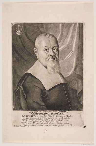 This is Johann Alexander Böner's "Portret van Bartholomäus Pömer," an engraving showcased at the Rijksmuseum. Immediately, one is struck by its formal clarity and meticulous detail, rendered through fine, precise lines. The oval frame tightly encloses the subject, Bartholomäus Pömer, drawing our attention to his composed expression and dignified attire. Böner's use of line not only defines the subject's features and clothing but also creates a sense of depth and texture. The contrast between the dark fur coat and the intricate lace collar highlights the sitter's status. The lines of the engraving also function semiotically. Note how the lines around Pömer's face are softer to convey warmth, juxtaposed to his fur coat which has more heavily engraved lines. The composition, while traditional in its portraiture format, uses the oval frame to subtly destabilize conventional notions of space, suggesting a world both contained and infinite. This piece exemplifies how formal elements converge to reflect broader cultural values of status and representation.