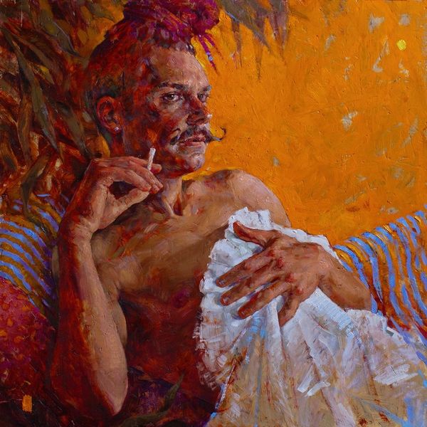 Editor: We’re looking at "Laurent Laurent," an oil painting by Tania Rivilis. I'm struck by how intimate and almost theatrical it feels – like the subject is posing for a gaze, and we're intruding somehow. How do you read this piece? Curator: That feeling of intrusion, I think, speaks to the politics of portraiture itself. Who is being represented and why? In this image, what societal expectations are projected onto Laurent by Rivilis, as the artist, but also by us, as viewers encountering it within a museum setting? The casual tank top and relaxed pose might suggest accessibility, but the knowing look and precisely groomed mustache complicate that, don't you think? Editor: Yes, the mustache is doing a lot of work! It feels self-conscious, maybe? And it's interesting to consider the artist's role too; Rivilis is choosing to portray him this way. What does that say? Curator: Precisely. The artist, like the museum, is a filter. By selecting and framing Laurent, Rivilis contributes to the construction of his identity – one presented for public consumption. What is Rivilis’ intention, or her potential statement about the relationship between the private and public self in modern society, in displaying him in that manner? Editor: So, it's not just about a single person, but about larger societal expectations and the performance of identity within those frameworks? Curator: Exactly. Consider how traditional portraiture has historically been used to communicate power and status. While “Laurent Laurent” breaks from those conventions with its informality, it still prompts us to ask: what forms of power are at play here? And who benefits from this particular representation? Editor: I hadn't thought about it in terms of power dynamics before. Seeing it that way gives me a totally different appreciation. Curator: It highlights the significance of viewing art not in isolation, but as active participants within complex cultural and historical conversations. I think you'll see the politics of imagery in all sorts of portraits after this discussion.