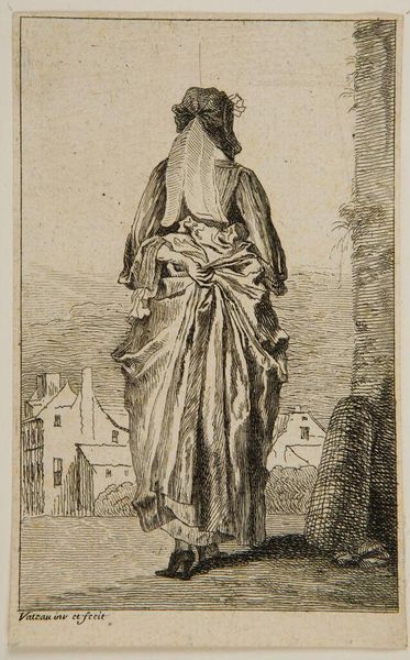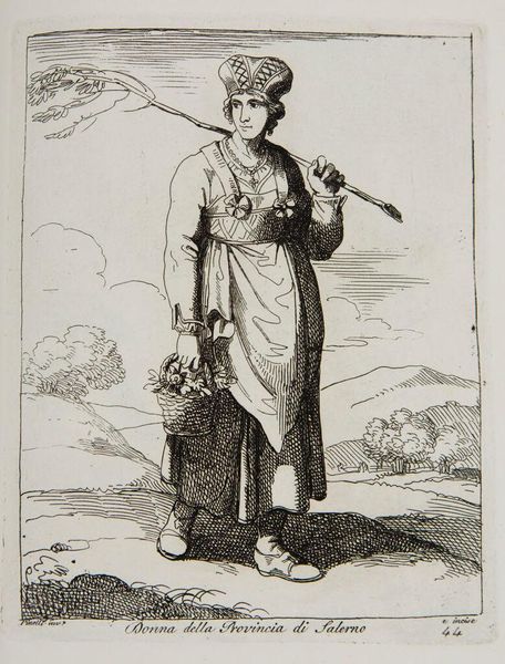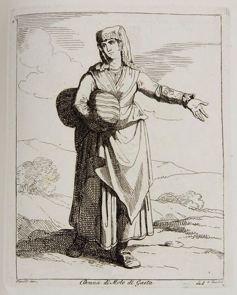 Curator: This is Bartolomeo Pinelli's "Woman from Sessa." Pinelli, born in 1781, captured the everyday life of the Italian people. Editor: The stark contrast and linear quality give it a neoclassical feel, yet there's an underlying simplicity in the figure's posture. Curator: She is a symbol of the Roman Campagna—her clothing, the way she carries the basket, a cultural touchstone. These details represent the ideals of rural virtue. Editor: True, but note the composition; she occupies almost all the picture plane. The landscape is secondary, merely suggested, reinforcing her presence. Curator: It's about the cultural memory, and her stoicism becomes a vessel for those values. She embodies a community's way of life. Editor: The etching technique, so prevalent at the time, feels perfectly suited to convey the woman's strength—it's all right there in the lines. Curator: Indeed. It's more than an image; it's a mirror reflecting society's understanding of itself, distilled into a figure. Editor: A powerful testament to the beauty of simple lines and profound cultural weight.