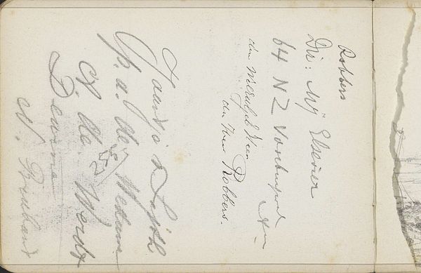 This is "Naam en adres" by Jan Willem van Borselen, held at the Rijksmuseum. This delicate piece offers a glimpse into the social fabric of the 19th century. In an era defined by rapid industrialization and shifting social hierarchies, the act of recording a name and address becomes more than a simple notation. It's a statement of identity, a declaration of belonging within a society undergoing profound change. Van Borselen, working in a time of evolving class structures, captures a moment of connection, a bridge between individuals within a transforming world. The handwriting itself tells a story, hinting at the education, social standing, and personal history of the writer. Consider how this simple act of recording personal information reflects the broader anxieties and aspirations of a society grappling with questions of identity and place. It is an intimate look at how individuals sought to define themselves amid a rapidly changing world.