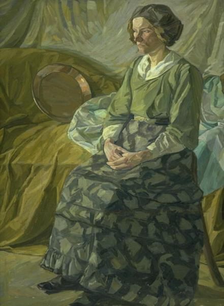 Curator: Jacek Malczewski's “The Finished Song – Portrait of Róża Aleksandrowicz” from 1919, catches the eye immediately with its intriguing juxtaposition of formal portraiture and pastoral landscape. Editor: Oh, absolutely! I'm struck by her somber expression against this almost whimsical background, like a cloud passing over a sunny field. Curator: Indeed. Notice the tactile quality of the oil paint, particularly in her velvet dress. The visible brushstrokes really bring out the luxuriousness, which of course, speaks to the status of both the sitter and the artist's patron. Editor: It feels like a scene plucked from a half-remembered dream, though. That blurred line of figures in the background—who are they? Is that supposed to be a chorus, or are they just ghosts of the song she’s finished? Curator: Well, Malczewski was deeply invested in Polish symbolism and romanticism. So those figures could be read as representing the Polish people. Her finished song representing a lament perhaps, but also, crucially, a completion of creative labor. This was made just after WWI had ended. Consider too how the painting's materials, readily accessible, oil on canvas, link it to both high art and a form of cultural resilience. Editor: Mmm. I wonder what Róża herself thought about being immortalized like this—part queen, part mournful muse. Her little handbag adds to the mystery, you know, secrets held close. Maybe the song is encoded in it. Curator: Perhaps! And from my point of view, let’s not dismiss the economics here. A portrait of this scale would have signaled serious patronage. The dress would be sourced carefully and intentionally selected. The entire scene speaks volumes about a moment in cultural history and material production. Editor: Alright, point taken. But as much as I love knowing about the economic background, for me this painting will always sing with its bittersweet mood, suspended somewhere between earth and sky. It’s about how melancholy can coexist with great beauty, isn't it? Curator: I can definitely agree with that! And appreciating both these perspectives opens richer views onto understanding this very layered artwork.