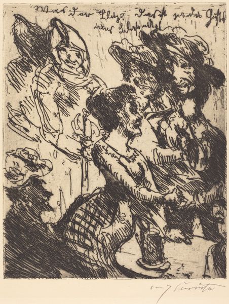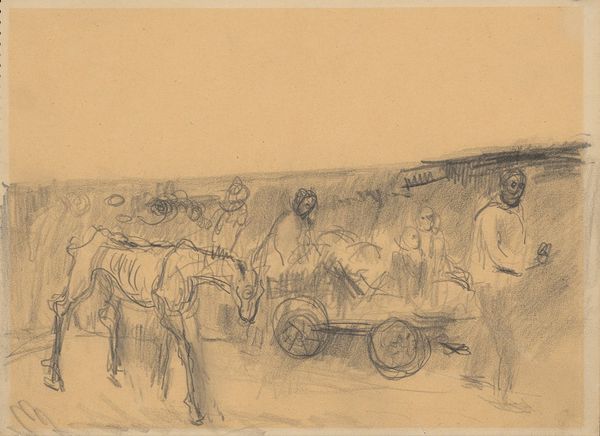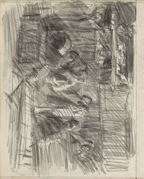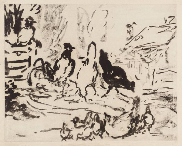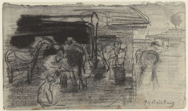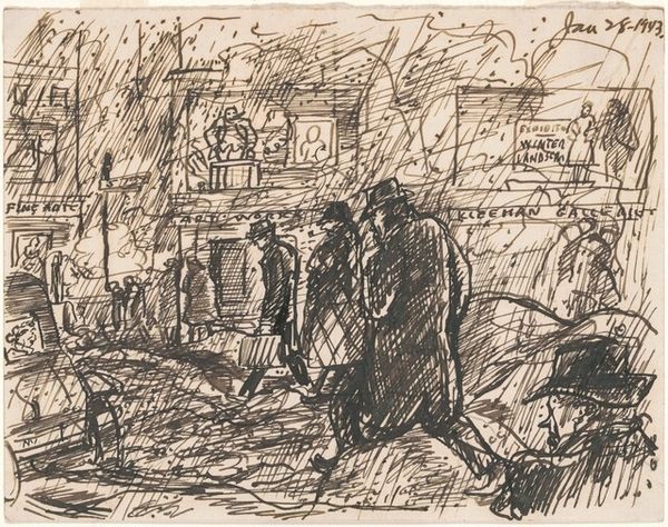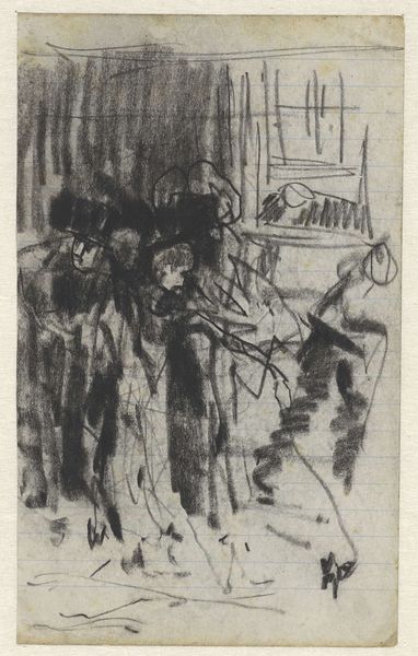Curator: Let's discuss Rik Wouters' "Toeschouwers in gesprek op de renbaan te Boitsfort," created between 1892 and 1916. It's rendered in ink, a simple medium used with tremendous flair here. Editor: It feels so… alive, doesn't it? All the figures are barely sketched out, but they still vibrate with this energetic buzz of people-watching at the races. You can almost hear the excited chatter. Curator: Precisely! The dynamism you perceive stems from Wouters' mastery of line and composition. Notice how the vertical strokes of the barriers contrast with the gestural curves suggesting the crowd and movement, structuring the implied space. Editor: It’s incredible how he suggests depth with just a few lines. I'm especially drawn to that lone figure on the left, with that distinctive conical hat – he looks a bit like an elongated hieroglyph. Is he a race official, do you think? Curator: It is quite possible, his stance implies some position of authority. What I find compelling is Wouters' ability to capture a specific social milieu through purely formal means. The inky blacks against the bare paper, the rhythmic repetition of forms—they evoke the sensory overload of the racetrack. Editor: Right! It captures that exhilarating mix of anticipation and frenzy. It's as if he is capturing the feeling of fleeting moments and raw emotions from the impression of speed of those passing moments! Do you feel Wouters had any influence from Impressionists? Curator: The mark making and the way it uses light suggests that influence! While it lacks the color palette typical of Impressionism, the sketch nonetheless succeeds in translating a fleeting moment onto paper, preserving it through the considered application of these simple materials. Editor: The simplicity in approach emphasizes his skill, leaving the audience to fill in gaps, coloring the moment themselves with their experiences. Which gives the artwork life each time someone engages with it, isn't it magic? Curator: Absolutely. It's a masterful display of suggestion and reduction. It compels us to consider how much information is truly necessary to convey an atmosphere, a feeling. Editor: A valuable lesson in artistic economy and a reminder that less truly can be more. It offers an incredible testament to how well an economy in style makes for a grand image in result!