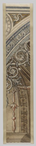 Curator: Take a look at this stunning preparatory drawing, titled "Fragmenten karton voor het glasraam in de westgevel van Joris van Egmond (Bisschop van Utrecht 1535-1559) voor de Sint Bavo Kerk te Haarlem," created around 1541 by Gerrit Boels. Editor: Wow, it’s surprisingly spare! Gives off a sense of blueprint rigidity mixed with that flamboyant Northern Renaissance ornamentation, but stripped of the glass colors, it feels...unfinished? Curator: It's ink and colored pencil on paper, and it's fascinating precisely because it shows us the scaffolding behind the finished window. You can almost feel the artist puzzling out the structural logic, piece by piece. Editor: Exactly! I’m curious about the pigment choices here, limited though they are. The cool blues and browns make me wonder about their sourcing. How would Boels acquire those pigments in the 16th century, and what sort of labour would that have entailed? Was this paper locally made too, or part of longer trade routes? Curator: That's the heart of it, isn't it? These weren't just materials, but the product of intense labor and commerce. You can see a deliberate refinement in the lines; his dedication is plain to see, carefully charting all of this complex ornamentation. I keep coming back to the face in the top medallion – the potentiality there feels potent. Editor: That face, supposedly Bishop Joris, really brings the entire exercise down to a very material level; the production of an idealized image for authority, carefully sketched and plotted. I wonder how much autonomy the artist really had, or were these essentially commissions dictating every last cherub and curl? Curator: Such a pertinent point! It pulls us into the tensions between creative agency and patronage in the 16th century. I see an artistry pushing the established boundaries. Editor: Precisely! It invites so much further scrutiny into how art creation functioned then; materials, labor and political structures – how they combined! Curator: What a fascinating glimpse into a work in progress; you've unearthed so many crucial threads here. Thank you! Editor: Thanks, it is important to appreciate not just the aesthetics but the tangible building blocks!