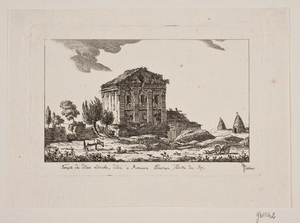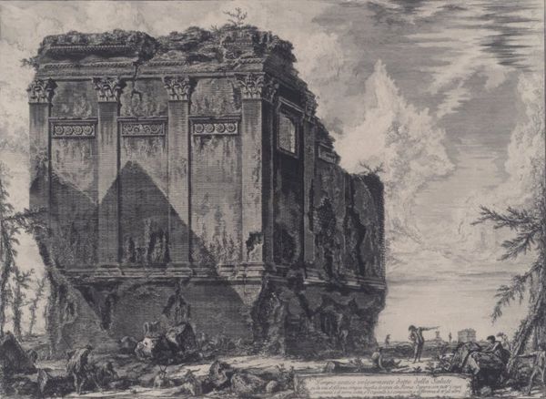 Curator: This is Giovanni Battista Piranesi's "The so-called Temple of Salus, on the road to Albano," an etching and engraving from around 1758-1768. It’s currently held at the Metropolitan Museum of Art. Editor: What strikes me immediately is the palpable sense of decay and neglect. Look at how the building is crumbling. You can almost feel the weight of centuries bearing down. Curator: Piranesi was fascinated by ruins, seeing in them a grandeur that surpassed even the most perfectly preserved classical structures. Notice how the 'Temple of Salus,' though dilapidated, still commands attention, an assertion of historical significance. The figures in the foreground underscore that sense of scale. Editor: And what were its original materials? Stone, brick, definitely. I wonder what processes led to its degradation, and how that decay itself might contribute a kind of sublime beauty. Curator: The temple’s symbolic associations are tied to the concept of 'Salus' – safety, well-being, health. It evokes ideas about societal stability and the transience of human achievements. Perhaps that is what's creating that sense of awe that you're referring to. Editor: Right, how what once served an essential social function is now just material debris. Its symbolic power rests solely in the image, in our acts of observation, of reconstruction in our own minds. Is that not somewhat cynical? Curator: Perhaps, but consider that even in ruins, the 'Temple' retains a capacity to evoke powerful emotions and reflections. It reminds us of the cyclical nature of civilizations and invites meditation. Editor: It's an elegy cast in stone and etched into paper, using those material components to explore a kind of material futility. That's how Piranesi communicates on an essential human level about the world and the built environment that surrounds him and us. Curator: Exactly. The image encapsulates ideas of memory and history so potently and shows us how the power of symbols remains relevant even when their original contexts fade. Editor: A compelling visual document, that reminds us about art’s capability of conveying deep historical realities. I've learned quite a lot by exploring this piece!