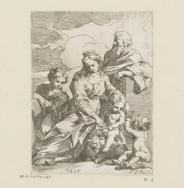 Curator: This print, made sometime between 1600 and 1630, is titled "H. Johannes met adelaar," which translates to "St. John with Eagle." It's an engraving done in the Baroque style, attributed to an artist known only as Monogrammist VA. Editor: Oh, look at him there, perched so casually amidst all that rugged landscape! He seems so absorbed, lost in his writing, as if composing poetry rather than, you know, sacred texts. Curator: Exactly! Consider the cultural moment. This work aligns with the Baroque interest in portraying emotional states and the drama of spiritual experience. We see John the Evangelist in a very human light, contemplating divine inspiration. His placement within a rocky scene perhaps references his period of exile on the island of Patmos. Editor: That eagle, looming there, is rather spectacular too! It dominates the composition, making me wonder if it symbolizes power, freedom, and heightened sight, while our saint humbly takes notes, head tilted down in modest contemplation. It looks like a vigilant secretary, ready to help St. John spread his message. What an odd couple. Curator: The eagle is, indeed, the symbol of St. John, meant to represent the soaring, spiritual nature of his Gospel. And there is an interplay here between John's humble posture and the grandeur of the eagle. This evokes theological questions, in line with our era of enlightenment where we continue to ask about power, perspective, and translation. Editor: Thinking about the setting and textures of the stones against the gentle draping of fabric and bare feet… It really shows a skilled engraver at play, using these contrasting elements to lead our eye through a narrative. It feels like stumbling upon this reflective, sacred scene mid-daydream. Curator: The engraving exemplifies the fusion of humanist learning and religious zeal that marked the period. It prompts contemplation not just of scripture but also of how sacred stories intersect with identity, culture, and personal narratives. Editor: You are right. There is much more to see here when you look through a historical lens. Curator: Precisely. I hope listeners now have some ways of looking at this print from that perspective. Editor: Yes. Now I am inspired to make some art too!