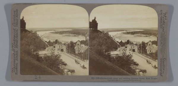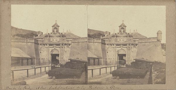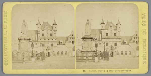 This stereo card photograph of Kasteel Falkenstein in the Harz region captures a castle set atop a hill, rendered in tones of brown and cream. The composition, divided into two nearly identical panels, invites a stereoscopic viewing experience, creating an illusion of depth. The structure of the image is particularly striking: the castle's tower dominates the skyline, a symbol of power and permanence. The surrounding foliage, rendered with a soft focus, contrasts with the hard, geometric lines of the architecture. The subdued palette creates a sense of timelessness, evoking a romantic vision of the past. The photograph's formal qualities extend beyond mere documentation. The structure is not just a representation of a place but an invitation to consider our relationship to history, memory, and the visual codes through which we perceive the world. It encourages a thoughtful examination of the visual elements and their impact on our understanding.