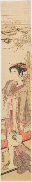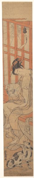 Editor: This is "Woman Entering Bath" by Suzuki Harunobu. It's a woodblock print, quite tall and narrow. The woman's pale skin contrasts beautifully with the pinks and greens. What do you make of the way Harunobu uses color and line in this print? Curator: It's crucial to recognize the materiality here. Ukiyo-e prints, like this one, were products of a collaborative system. The artist’s design was transferred by craftsmen through carving woodblocks for each color, then printed. How does that division of labor and process affect our understanding of Harunobu’s artistic intentions? Editor: So, the final product is shaped by many hands, not just Harunobu's initial vision? Curator: Precisely! And consider the dissemination of these prints. They were commodities, affordable to a growing urban population. This challenges notions of the artist as a singular genius and raises questions about the consumption of beauty in 18th-century Edo. Editor: I never thought about it that way. It adds a whole new layer of understanding! Curator: Indeed! It moves us beyond just admiring the aesthetic to understanding the social fabric that produced it.