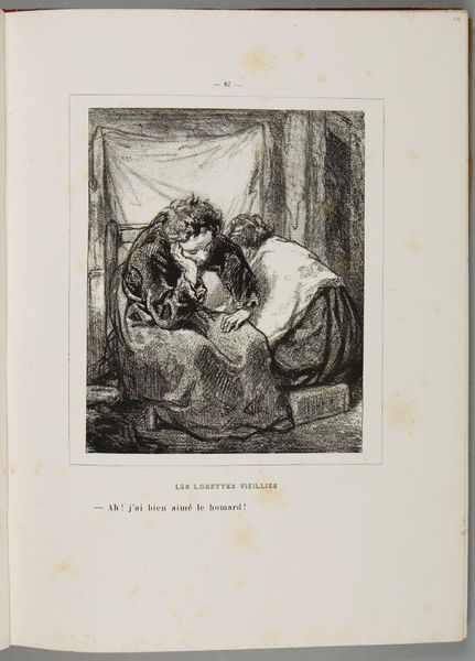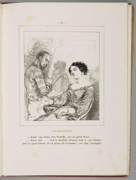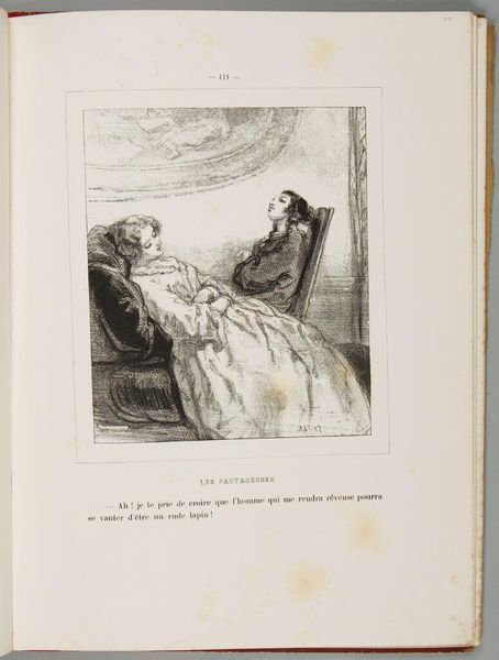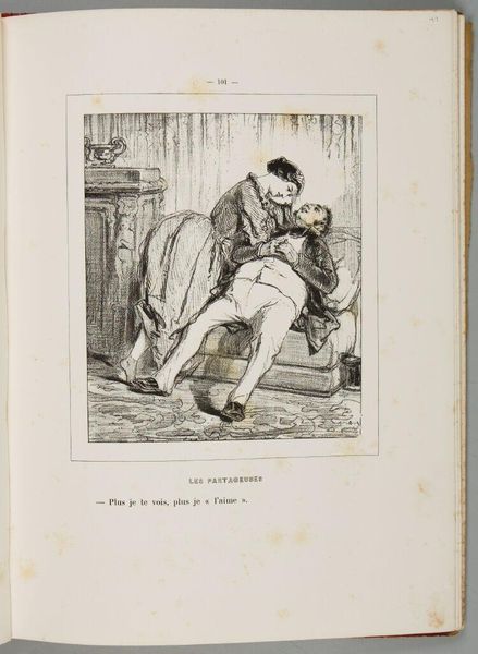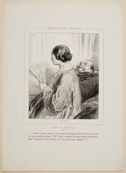 Editor: This print by Paul Gavarni, titled "Well, my dear, at the next carnival, I gave a son to him, to that animal. And so? And so he didn't want it!" depicts a seated couple. The line work feels so expressive. What do you see in this piece? Curator: Gavarni's work reflects the social satire prevalent in 19th-century France. Consider how the print media allowed artists to comment on class, gender, and morality, reaching a broad audience. The "carnival" setting is key, masking social realities. Editor: So, it’s a commentary on social structures, hidden behind the carnival? Curator: Precisely! The print likely critiques societal expectations around family and legitimacy, reflecting the era's complex socio-political landscape and illustrating the artist’s role in shaping public discourse. What do you make of their posture? Editor: Their intimacy seems performative. This has given me a lot to think about regarding art's function in society. Curator: Indeed. It reveals how art can mirror and influence our understanding of social norms.
