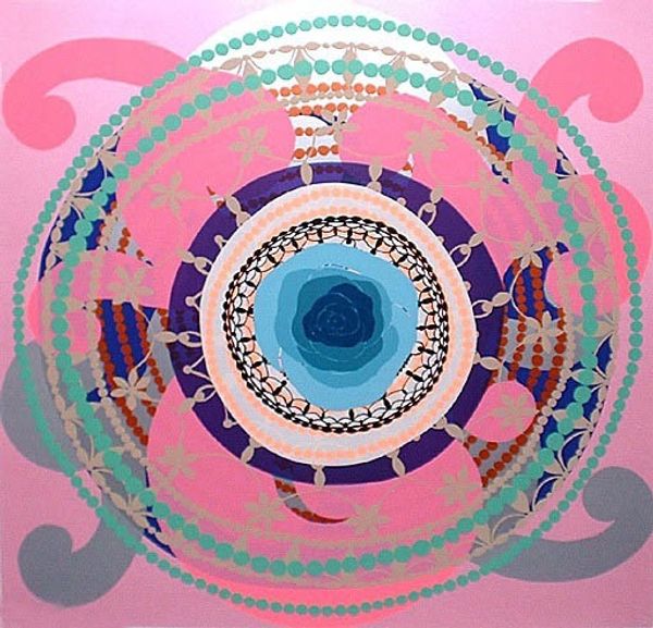 Editor: We're looking at Ion Alin Gheorghiu's painting, "Hanging Garden," made with acrylic paint, ink, and textile. It feels like looking into a kaleidoscope. What do you see in this piece? Curator: I see a powerful commentary on constructed realities and nature. Gheorghiu, working within an abstract expressionist mode, is clearly referencing the visual language of organic forms, but there's a distinct artificiality due to the symmetrical, almost mirrored, composition. Editor: Mirrored? Now that you mention it, I can see that it’s symmetrical along the vertical axis. Curator: Exactly! And the 'hanging garden' as a concept is itself a construction, a human imposition upon nature. What if we see the symmetrical form as a reference to Rorschach tests, these well-known psychological instruments designed to reflect back a subject's own mental state. How does that affect your viewing? Editor: I never thought of that. If it’s like a Rorschach test, that would place me and my experiences as central to its interpretation. It asks me to delve into my own understanding of nature. Curator: Precisely! Moreover, consider the materials – acrylic, ink, textile – brought together, seemingly disparate, almost as symbols of imposed order. Gheorghiu is nudging us to ask: what does "nature" really mean when filtered through human experience? How has power shaped our experience of nature? Editor: It’s not just a pretty picture then; it's about challenging my own assumptions about nature and how culture impacts it. Curator: Indeed. Art has the ability to transform us if we actively meet its challenges, questioning and examining the cultural imprints that surround us.