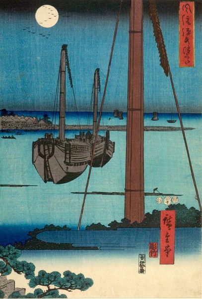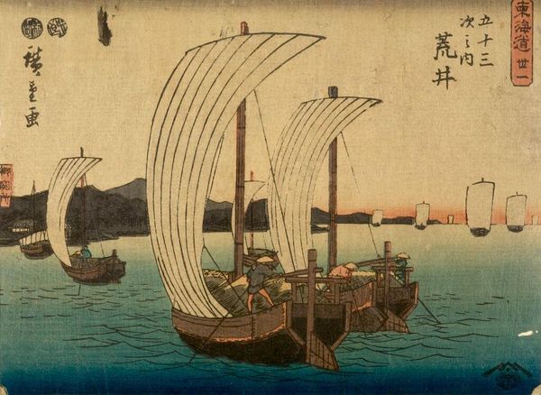 Curator: This is the left sheet of a triptych by Utagawa Kuniyoshi, who lived from 1797 to 1861, depicting "The Battle of the Uji River." Editor: It's really quite dramatic. I'm immediately struck by how turbulent the water is. The artist has captured such a sense of struggle. Curator: Indeed. Kuniyoshi’s prints often explore themes of valor and sacrifice within the context of Japanese warrior culture and the sociopolitical tensions of his time. We can read the battle itself as a manifestation of wider ideological conflicts. Editor: I’m interested in the materiality of the print itself. Woodblock printing allowed for the mass dissemination of these images, making these stories and values accessible to a broader public. Curator: Yes, and considering the warrior's garb and weaponry provides insights into the militaristic ideals projected onto the population, especially regarding masculinity and social order. Editor: Thinking about the hands involved in the whole process – the artist, the carvers, the printers – highlights the collaborative nature of printmaking and the labor involved in creating this visual culture. Curator: Considering this work's narrative and the means of its production really enriches our appreciation. Editor: I agree, there's so much to unpack when you consider the historical context and the artist's technique.
