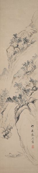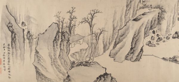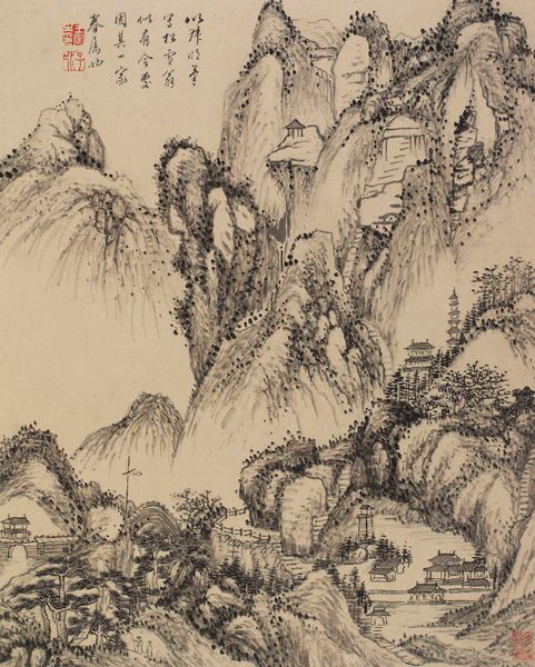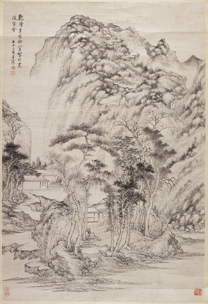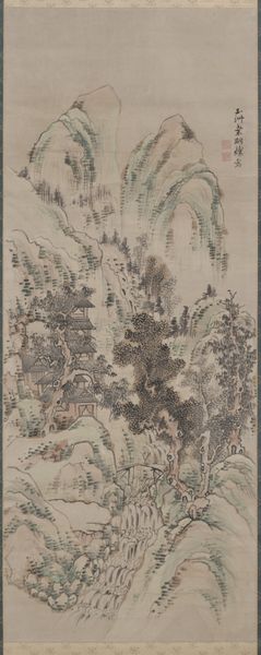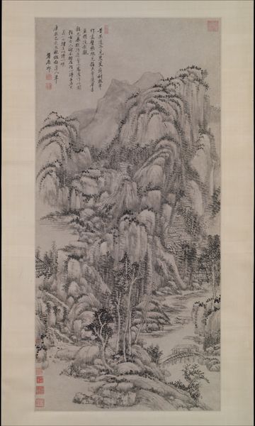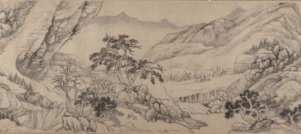 Curator: Standing before us is "Mountain Landscape," potentially created around 1851 by Kichibei Shōkoku. This ink drawing currently resides at the Minneapolis Institute of Art. Editor: It’s quite atmospheric, isn’t it? The composition, all verticality and mist, feels almost weightless, ethereal even. There is a palpable sense of scale delivered through these layered mountains, receding softly into the background. Curator: Indeed. Shōkoku masterfully employs ink wash techniques to convey depth and spatial recession. Note how he eschews stark outlines, favoring instead nuanced gradations to model the forms of the mountains and trees. The light, or lack thereof, directs the viewer's eyes. Editor: The human figures—those monks crossing the bridge—are cleverly positioned to further enhance this impression of grandeur, underlining humanity’s relatively humble position within the natural order. Their inclusion elevates what might otherwise be a straightforward landscape to something bordering on the allegorical, perhaps alluding to journey, or pilgrimage. Curator: Precisely. Landscapes during this period weren't merely depictions of scenery. They were often imbued with philosophical underpinnings, reflections on the relationship between man and nature. Here, the brushstrokes themselves mimic the forms they represent, short and choppy for the rocks, soft and flowing for the water. Editor: I appreciate, too, how the artist resists any clear focal point. Our eye roams freely, encouraged by the winding paths and gentle shifts in tone. It contributes to this sense of a unified whole, where individual elements are secondary to the overriding mood of contemplative serenity. Even without any specialized knowledge, there’s an intuitive understanding accessible through the visual syntax of this artwork. Curator: It also evokes an era of social and cultural shift in Japan. The Meiji Restoration was around the corner, which had an impact on all forms of traditional art, imbuing it with the desire to create and discover individual expression. Editor: I agree; viewing it with this historical context enriches the emotional dimensions of this piece. This exercise in historical art allows you to see through the eyes and brushstrokes of the past. Curator: Yes. “Mountain Landscape” serves as a visual portal into the values and beliefs of the past, reminding us how inextricably linked art is with cultural context.