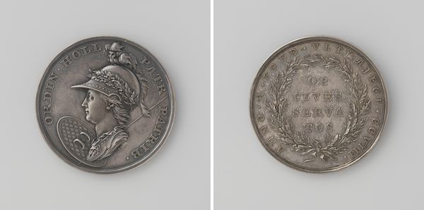 Editor: So, this is a medal commemorating the Battle of Blenheim, made in 1704 by Georg Hautsch. It's a metal relief sculpture. The battle scene is incredibly detailed, almost overwhelming. What do you make of the composition, in terms of leading the eye? Curator: Formally, observe the juxtaposition of the two sides. The obverse presents a portrait, capturing individual features, and utilizes a circular inscription to contain it. Contrast this with the reverse, which presents an active scene rendered with many figures; its composition uses the entire field and terminates at the border. Do you see a dynamic asymmetry between these two faces of the medal? Editor: I see what you mean. The portrait side feels very controlled and still, whereas the battle scene is chaotic. It’s interesting how different the textures appear, too. One side feels smooth, and the other is quite rough with all the figures and activity depicted. Curator: Indeed, and notice how the incised inscription frames the image. The lettering does not only function as description but also as a structural device. Ask yourself, how would our reading of the piece change if the letters were omitted? Editor: That’s a great question, because it helps bind the scene to a specific time. Taking the text away would lose some detail. It makes me think about how inscriptions give medals a lasting importance. It seems that they're trying to present not just beauty but also something more meaningful. Curator: Precisely, and with the understanding of these intricacies, we find the piece transformed into more than just decoration, or a simple piece of metal. We begin to perceive a potent symbolic artefact that transcends its immediate visual qualities. Editor: It’s fascinating to consider how the medal operates on these different levels simultaneously. I hadn’t considered all these elements, but thinking about it formally has certainly enhanced my understanding. Curator: Indeed, careful attention to its construction, technique, and composition, provides much food for thought.