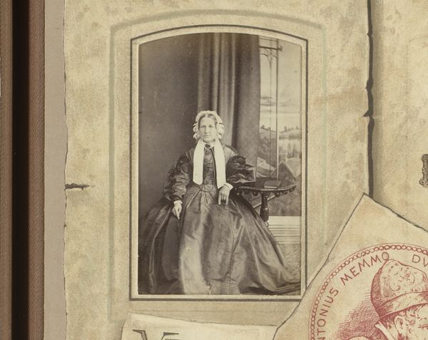 Curator: What a pensive study. The work is titled "Portret van een vrouw," or "Portrait of a Woman," created sometime between 1860 and 1900 by Charles Neve. It’s an albumen print, which was quite popular during that period. Editor: The sepia tones create such a wistful atmosphere. The framing emphasizes the subject's pose, the soft light really highlighting her features. Her gaze holds a certain… detachment. Curator: Indeed. Albumen prints were produced through a fascinating, if labour-intensive, process. Egg whites were used to bind the photographic chemicals to the paper. The artist or technician had to control many variables to obtain a lasting image. This was often repetitive and subject to the conditions present in their immediate environs. Editor: The striped garment draws my eye, especially contrasted with the ornate lace. Notice how the lines subtly curve with her form, guiding the viewer's attention. This is very deliberate in design terms. Curator: The dress tells its own story of manufacture, perhaps even of commerce and distribution of materials at the time this portrait was conceived. Mass produced materials were widely available, impacting representation through the class background indicated by the sitters garment. How that interacts with a more laborious craft like photography adds a complicated narrative layer to this piece. Editor: That contrast between what seems like readily accessible print medium for photography with this carefully chosen garment is very provocative. The pose almost evokes classic portraiture but the materiality and construction of the image make it unique to its period. Curator: By understanding these photographic processes we’re able to examine Victorian society and consider the rise of the middle classes. Photography became a way for those not historically captured in paint, such as middle classes, to represent themselves. It's fascinating to reflect how accessibility impacted art. Editor: Reflecting on form and context here is key. The subject’s wistful gaze takes on greater depth considering all you’ve pointed out, adding new significance to a relatively simple image. Curator: Yes, understanding these elements can greatly enrich our understanding and relationship to the image. Editor: Absolutely, and in turn that impacts our emotional engagement with an old portrait like this one.