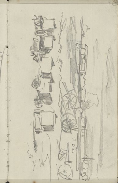 George Hendrik Breitner made this drawing of moored boats with graphite on paper. The softness of the graphite allows for a range of tonal effects, from the faintest suggestion of a horizon line, to darker hatching that indicates the mass of the boats. The visible strokes, smudges, and erasures reveal the artist's process, and the texture of the paper adds to the sense of immediacy. This isn't about slickness; the interest is in the labour of mark-making. Consider the directness of the lines, and their arrangement on the page. It's tempting to see this as a preliminary study for a painting, but it also stands alone, bearing witness to the working harbor and the artist’s experience of it. Breitner wasn’t so concerned with capturing the flawless likeness of the boats, so much as evoking the energy and the atmosphere of the working harbor. He brings into the realm of fine art, a scene of the everyday.