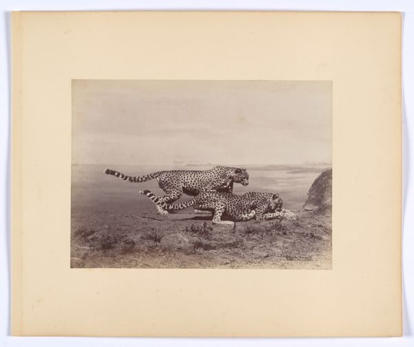 Curator: Look at that fella, caught right on the precipice, hasn't he? Almost like he’s guarding the edge of the world. Editor: It does give that impression! We are viewing an 1886 gelatin silver print titled "[Fox]" by Ottomar Anschütz, currently residing here at the Metropolitan Museum of Art. It immediately strikes me as somber, stark, in its monochromatic stillness. Curator: Somber, you say? I see a flicker of mischief in his eye, like he’s about to dart away with some secret only he knows. It reminds me of the time I tried to outsmart a fox in my backyard; utterly hopeless endeavor! Editor: Interesting observation! I find myself considering the photographic technology available at that time. This feels staged in a way that natural history images can often be, right? I imagine he would need to be very still for the long exposure time. What this choice of representation signals about our changing view on our interactions with the animal world is fascinating! Curator: Possibly staged, yes. But it still manages to feel raw. Perhaps it's because this isn't some romanticized studio backdrop, just dirt and sky. Also, I've often thought about how an image fixes in time, like fossilized moments. It lends the scene an air of being from a long time ago. Editor: I am wondering about the choice of using gelatine silver prints—there seems to be a kind of democratisation of image creation, if we think about who gets to depict foxes, for what purposes and for what kind of audience. This sort of neutral observation can be read alongside debates around access to hunting for example. Curator: Hunting, yes! Nature as sport, as power… it also brings a sense of nature under threat, or as a domain being encroached. The lone figure almost looks vigilant of the land being stolen around him. Editor: Absolutely. The act of photographing becomes another form of taking, of possessing. Curator: That, my friend, puts a rather sobering lens on our innocent fox! Editor: And the story behind images is as important as their subjects. Something to ponder as we move on!