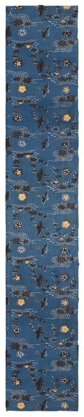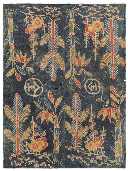 Curator: Looking at this length of blue textile, dating from the 19th century, makes me feel calm but also oddly alert—does it do the same for you? Editor: Yes, it's the intensity of that blue—like a deep ocean just before a storm. I love the bamboo motif though, it softens that intensity. Curator: The piece is held in the Minneapolis Institute of Art's collection. Its beauty lies in the details, the way those stylized bamboo shoots repeat and intersect. The almost minimalist depiction reminds me of haiku. Editor: You're right. Bamboo, in Japanese art and culture, represents resilience, flexibility...it bends but doesn't break. See how the arrangement has those vertical lines like falling rain? It really draws the eye upward. There is so much visual poetry here! Curator: And consider the blue dye itself. Indigo, probably. Think of the labor involved in producing it, the cultural value placed on it. It's not just a pretty backdrop, but a canvas layered with stories. Editor: Absolutely, every symbol is infused with generations of stories. The stylized blossoms – those umbrella-like forms floating amidst the bamboo, are they chrysanthemums? In Japanese symbolism, they represent longevity, don’t they? A powerful, auspicious pattern that someone might have carried or worn... Curator: Perhaps for a festival, a special event... or to give to someone during the most difficult event of their lives. That intersection between personal intention, the symbolism in the imagery, and the craft of textile production, fascinates me the most. The work suggests a conversation between life and the ephemeral nature of beauty. Editor: For me, it's the repetition that resonates. These repeating forms represent continuity—life, nature, memories endlessly flowing onward, like water and bamboo, together, as one... a lovely pattern, indeed.