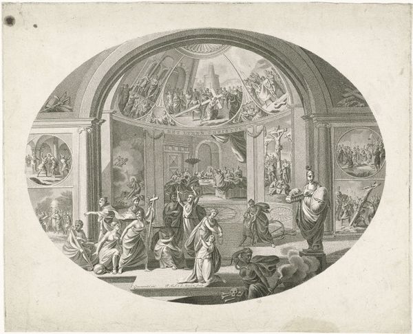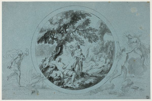 Editor: Here we have "Rinaldo en Armida," a drawing from somewhere between 1683 and 1733 by Bernard Picart, housed here at the Rijksmuseum. It's quite elaborate, filled with figures. I'm struck by the sheer density of the composition and all the allegorical references. What do you see in this piece, considering its place in history? Curator: What strikes me is how Picart uses the visual language of Baroque art to represent complex political ideas. Think about the public role of imagery at that time. The "Rinaldo and Armida" story, pulled from Tasso's epic poem, wasn't just about romance; it was about duty versus desire, temptation, and ultimately, perhaps, the right use of power. The lavish detail – the cherubs, the drapery – would have been instantly recognizable to an educated 18th-century audience as signifiers of wealth and authority, but perhaps with a touch of self-aware irony? Editor: So, you’re saying the abundance isn't just decorative, it is about the construction of power at the time? Are the museums or the Rijksmuseum having something to do with this ? Curator: Exactly! And consider where something like this might have been displayed originally, and for whom. It likely wasn't created for a truly "public" audience in the modern sense. It was for elite consumption. Did it celebrate power? Critique it subtly? Was it reinforcing certain political messages through allegory, especially to those with social visibility and political connections at that time. That's what interests me. Editor: That adds another layer to my understanding. I hadn't considered how the artistic style itself played a role in reinforcing a specific societal and cultural narrative. Curator: It's all about considering art not as isolated creations, but as active participants in social discourse, revealing to us the public roles played by images in the past. Editor: Fascinating! Now I'm looking at the Baroque style with a fresh perspective, not only regarding "Rinaldo and Armida," but within history in general!