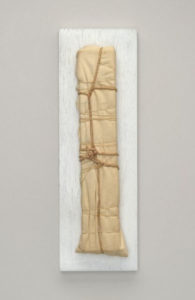 Editor: This is Christo's "Package" from 1961, a mixed-media assemblage. It strikes me as something concealed, maybe even suppressed. All that fabric and twine…it feels intentionally bound. What do you see in this piece? Curator: The act of wrapping immediately conjures a ritualistic practice, doesn't it? Think of ancient burials, sacred relics, precious gifts. The wrapping both hides and elevates the object, granting it a certain mystique. Consider, too, the psychological tension created—the desire to know what’s inside warring with the respect for the concealed. What emotions does that tension stir? Editor: I hadn’t thought of it that way. The wrapping does make it feel somehow important. It's interesting that you say ritual, as though this common everyday gesture can become something…else. But why this particular form? What makes it sculpture? Curator: Precisely. Consider that Christo isn't just presenting a package, but an *image* of one. It speaks to the language of display, doesn't it? By taking mundane actions such as wrapping and then blowing up scale, he reveals not only aesthetic patterns but exposes psychological structures regarding how society regards objects of everyday use. The cultural obsession with product fetish. How are your perceptions shifted? Editor: So, he’s making us reconsider something ordinary. It gives new symbolic weight, or visibility, to things we would overlook otherwise. That feels…powerful. Curator: And it highlights the intrinsic value, making viewers question pre-conceived notions on what should matter in cultural consciousness. These actions show hidden worth within the fabric of mundane living, encouraging us to value cultural experience over preconceived expectation. Editor: This was so helpful! I really got new understandings. Curator: Me too; thanks for sharing perspectives.