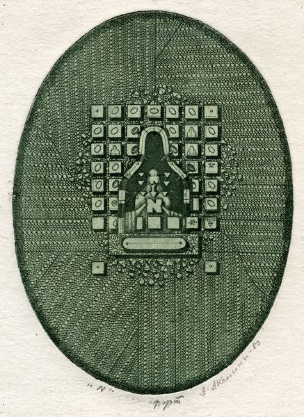 Oleksandr Aksinin created this untitled exlibris print with an intriguing use of etching, an oval shape, and intricate patterns. The composition is dominated by circles within circles. These shapes create a sense of depth and draw us into the artwork's core. The outer field teems with dense, stippled patterns reminiscent of cellular structures. Embedded within this field are tiny containers, perhaps representing the artist's or patron's name. The central image is of a stylized tree or a fan of knowledge. This is constructed from precise lines and geometric partitions suggesting both order and complexity. Aksinin's method reflects a broader artistic trend of challenging fixed meanings through structural complexity. Notice how Aksinin used the formal elements of pattern, shape, and symmetry to produce a symbolic meditation on knowledge and containment. This artwork invites us to look beyond the surface, prompting us to reinterpret established meanings, values, and categories within the structure of art.
