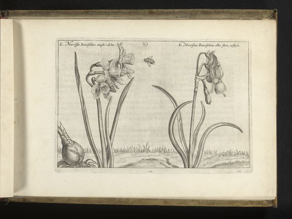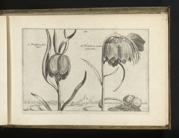 Simon van de Passe created this engraving, titled 'Twee soorten fritillaria', during the early 17th century, a time when the Dutch Republic was flourishing as a center for trade and scientific exploration. The print showcases two varieties of fritillaria flowers, reflecting the era's fascination with botany and natural history. It’s hard to ignore the cultural context of the "Tulip Mania" that gripped the Netherlands around this time. Flowers, particularly rare varieties, became symbols of wealth and status. Van de Passe, as an engraver, played a crucial role in disseminating knowledge and shaping perceptions of the natural world. His detailed rendering invites us to consider the intersection of art, science, and commerce in Dutch Golden Age society. The presence of the bee, a small but significant detail, adds a layer of ecological awareness, reminding us of the interconnectedness of life. This quiet, precise image encapsulates a moment in history when the observation and classification of nature intertwined with human ambition and desire.