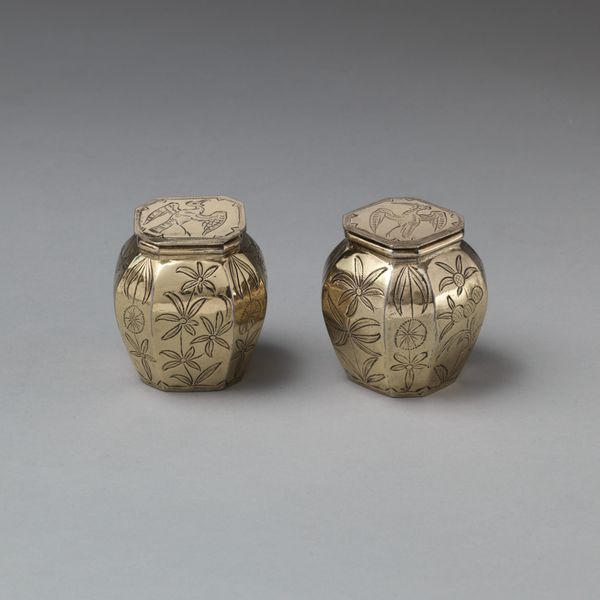 Curator: Look at this stunning pair of covered bowls, made of silver, created by William Fowle between 1683 and 1684. They are part of a toilet service. Editor: My first impression is that they feel incredibly precious, almost delicate, despite their metallic solidity. They are quite symmetrical and have a very Baroque-era feel to them. Curator: Absolutely. Let's consider the material here: silver. Its extraction from the earth, the labor involved in its mining and refining, all speak to a history of resource exploitation and the shaping of landscapes by human industry. The intricate engraving of foliate decoration adds another layer of crafted labor. Editor: Indeed. And who would have used these bowls? A wealthy person, of course, someone with the means to afford such luxurious items for personal care. These pieces reflect social stratification, and the gendered aspects of beautification practices within a certain societal echelon. What did having silver bowls for your toilet articles signify in the late 17th century? Curator: Exactly. And Fowle, the maker, how did his labor connect him to this elite consumer? What were his working conditions? Who supplied his materials? What workshops supported his endeavor? How does this particular set relate to his wider body of production and his historical status as a working craftsman? Editor: Further, we should also consider colonialism and trade. Where did this silver originate? Very often, silver of this era connects back to the exploitation of indigenous populations in the Americas and global trading routes shaped by inequality and forced labor. It wasn't *just* about luxury; these objects embody complex networks of power and control. Curator: These are very compelling contextual issues to ponder. One wonders how such gorgeous decorative pieces play into our current notions around ethically sourced objects. Editor: It challenges us to consider what remains unspoken when looking at beautiful items divorced from their complete history, and the complex economic practices they symbolize. Curator: Agreed. The material story of the bowls and covers provides us with crucial insight. Editor: It highlights just how crucial critical and historic analysis is to truly engaging with these precious pieces.