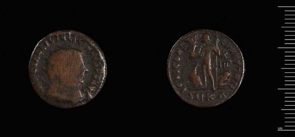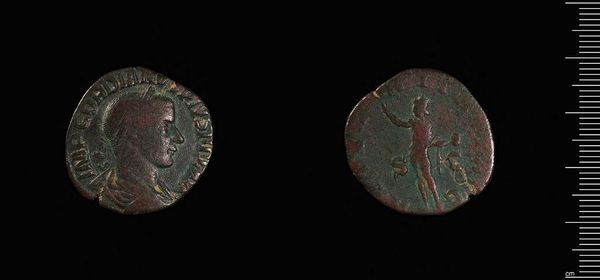 Curator: This is a sestertius of Alexander Severus, a Roman coin, bearing his portrait. It's striking how even a small object like this speaks volumes about power. Editor: I'm immediately drawn to the figure on the reverse—who is that, and what's the story there? Curator: That would be Spes, the Roman goddess of Hope, often depicted with a flower, connecting Alexander to ideas of prosperity and optimism for the future. Editor: It’s fascinating how the image of Spes was used to bolster public sentiment, offering reassurance, especially during times of uncertainty or political strife. What a clever use of imagery. Curator: Indeed. Coins were powerful propaganda tools, circulating the emperor’s image and desired message throughout the empire. They offer insight into the priorities of the Roman state. Editor: Looking at it now, I see the coin as not just currency, but a pocket-sized piece of political messaging, subtly shaping perceptions. Curator: Exactly! By looking at this small object, we can better understand how the Roman state worked to communicate with its people.
