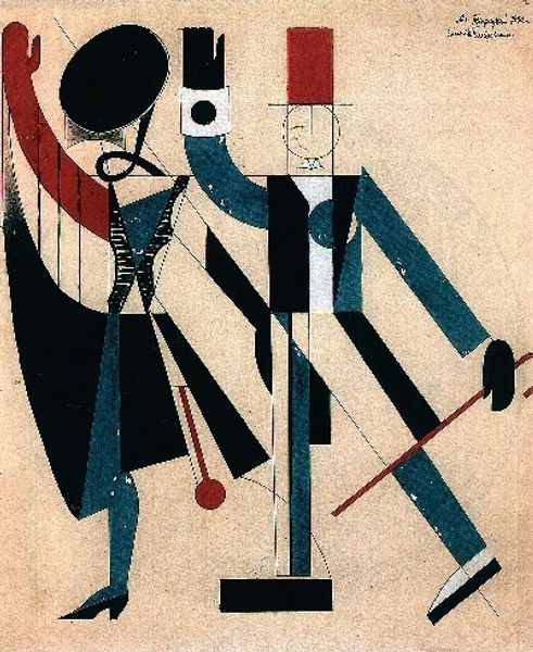 Vadym Meller created this costume design, sometime in the early twentieth century, using gouache, ink, and pencil on paper. The figure's angular pose and geometrically abstracted costume immediately command attention. Meller’s avant-garde aesthetic breaks down traditional forms into simplified shapes, particularly evident in the sharp triangles composing the shoulders and lower body. These shapes create a sense of dynamic movement, as if the figure is caught mid-stride. The color palette, dominated by reds, blues, and whites, adds to this dramatic effect. Note the stark contrast between the solid black boots and the pale backdrop, which flattens the space and heightens the design's graphic quality. This abstraction reflects broader artistic trends of the time, where artists sought to challenge fixed meanings and explore new modes of visual expression. Ultimately, the dynamic composition, with its interplay of line, shape, and color, destabilizes traditional notions of representation and invites us to see the human form in an entirely new light.