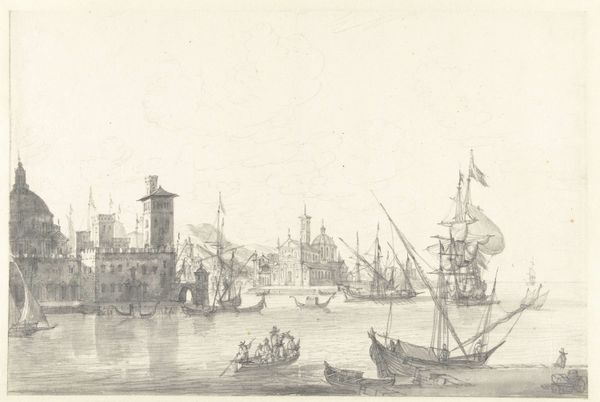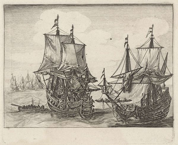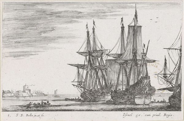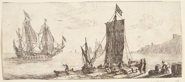 Curator: Look at this etching titled "Plate Four from Various Embarkments," attributed to Stefano della Bella. Editor: Wow, the first thing that hits me is the busyness, the sheer number of vessels crammed into the scene. It’s almost overwhelming! Like a 17th-century nautical traffic jam. Curator: Della Bella was very active during the Baroque era and highly regarded for his skill as a draughtsman and printmaker. This piece showcases his remarkable attention to detail, typical for the Baroque. It is one plate from a larger series, reflecting the increased maritime traffic of the time and, more subtly, power structures and economic expansions facilitated by sea trade. Editor: True, I see the intricacy, those tiny figures on the boats, the rigging of the ships. But it's also this contrast with the vastness of the sea and sky above. A metaphor maybe? Like humans striving within a boundless world. It makes me think about the weight of ambition, of expansion, pushing people outwards toward new horizons. Curator: Absolutely, we need to see beyond its mere appearance as a detailed record of ships. These "embarkments" are about economic ambitions of expanding empires—a concept neatly visualized. Think of it in the context of how rulers used imagery to underscore claims of control and legitimacy. This seemingly innocent landscape is far from politically neutral. Editor: I buy that! Still, for me, the power of the piece lies in the personal, human level. I imagine the sailors, their lives hanging in the balance as they venture across this formidable seascape. The light on the water hints at their dreams. It's melancholic but hopeful, somehow. It makes you wonder, what awaited them? Curator: A compelling point. While it does draw us into these intimate questions, its primary impact during that period would be as propaganda: silently boosting maritime prowess and influence. But how the meaning of the piece has changed—a story of empires or human adventure? That transformation interests me the most! Editor: Yeah, it's a testament to art's lasting power that it speaks across centuries on so many levels. History and dreams tangled together... kind of like those ships themselves. Curator: Exactly! It gives us so much to ponder.