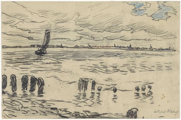 Editor: So, here we have Van Gogh's "Rhone with Boats and a Bridge," created in 1888 using pen and ink. What strikes me immediately is how dynamic it feels despite the limited color palette; it’s all about the movement he creates with the lines. What do you make of it? Curator: It’s funny you say that. To me, it’s more about stillness *within* movement, if that makes sense. The turbulent lines certainly give us that initial impression, but notice how the heavy, dark foreground anchors the whole scene. It feels almost like we're holding onto something solid while the world swirls around us, which knowing Van Gogh’s state of mind during that period, really resonates. What do you think he’s holding onto? Editor: That’s an interesting point. Maybe it’s his hope, or at least his attempt to find some stability amid the chaos? Curator: Exactly. The use of stark contrasts – light and shadow – definitely amplifies the drama. And look at the bridge and the city in the background – so meticulously rendered, almost fighting for attention against the expressive water. Do you get a sense of opposing forces? Editor: I do. It's as if he’s wrestling with the desire to capture the real world accurately while also conveying his very subjective, emotional experience of it. Curator: Precisely! And isn't that the beauty of it all? It is, ultimately, this tension that makes Van Gogh so compelling. Editor: Definitely. I never considered that element of holding on – that static foundation despite the overall fluidity – so I will definitely keep that in mind from now on! Thanks. Curator: My pleasure, happy to have shared my vision with you.