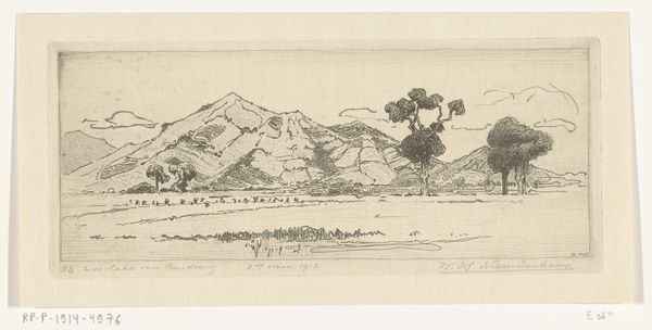 Editor: This woodcut by Johannes Frederik Engelbert ten Klooster, titled *Landschap, Midden-Java: Merbaboe, Merapi, Ello rivier* from 1923, presents a striking landscape. I’m intrigued by how simplified and geometric it is, almost like a visual code. What symbolic reading do you take from the composition? Curator: Indeed. Look closely; even the clouds have become stylized bands, and the mountains, Merapi especially, echoes something deeply primal. Notice how the artist employs strong horizontals balanced by dynamic verticals to express power, solidity and permanence, yes? This, while simplifying the mountain form into near symmetrical design. Might he suggest the sacred nature of place? Editor: I see what you mean about the mountain feeling almost like an altar. But why flatten such a potentially dramatic scene into such a pattern? Curator: Well, recall the rise of simplified aesthetics across art deco. But think also about the deeper symbolism: Mountains, globally, represent not only physical elevation but spiritual insight, enlightenment. Rivers symbolize the flow of life, passage. Consider this scene a container, its symbolic arrangement channeling forces known and unknown. Editor: So, beyond just showing us Java, ten Klooster is also presenting something about our relationship to the landscape? Curator: Precisely! In rendering the people so small compared to the landscape, aren't we subtly reminded of nature's dominance, our humble position within its grand design? Perhaps its even a warning not to get lost in the immediate when something grand exists beyond. Editor: That gives me a completely new perspective. I was seeing it as purely decorative, but now I recognize the underlying significance that gives the image real impact. Curator: Symbolism invites us to pause and consider layers of meaning in unexpected places, allowing these visual codes to activate memory and deepen our understanding.