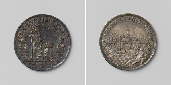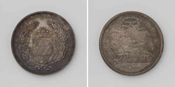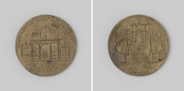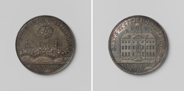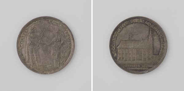 Editor: This is "Inwijding van het oude mannen- en vrouwenhuis Oudaen van de diaconie van de Nederduitsch Hervormde gemeente te Utrecht" – quite a title! It was made in 1759 by Johan George Holtzhey. As a print in metal and engraving, it has this flattened quality and the imagery feels more symbolic than literal. What jumps out to you? Curator: I find the coin intriguing due to its bipartite division. One side presents the architectural representation of the old men’s and women’s home, radiating with linear emanating light. Consider the implications of juxtaposing this physical structure with the inscriptions on the other side, surrounded by symbolic flourishes. Do you observe any other details? Editor: Well, the building side seems very grounded, literally depicted, whereas the other side, with the inscription, feels almost ethereal with the heraldic imagery on top. There's a clear separation in visual language between the practical and the symbolic. Why do you think Holtzhey chose such contrasting approaches on a single coin? Curator: Precisely. It's crucial to examine the formal relations at play here. The inscription's circular arrangement mirrors the coin's form, creating a self-contained system of meaning, wouldn't you agree? Editor: I do, especially since it lacks the rays of light that come from the building's roof, even if its meaning might seem opaque today. Curator: It reinforces the function of numismatic objects, or art more generally. Through its lines and shapes, Holtzhey’s medal invites contemplation beyond its literal message. Editor: I now see it is as more than just an artifact, but also an engagement of space within such a limited area, and each side does so differently! Curator: Yes, that tension and connection is central to the object.