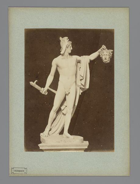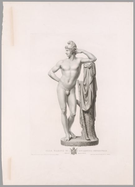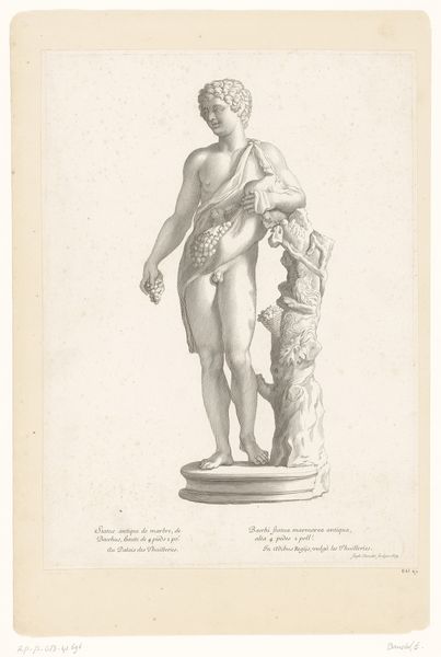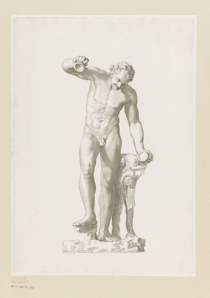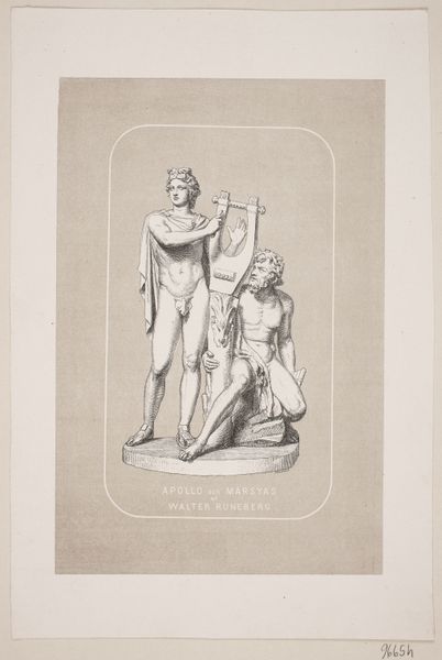 Curator: This intriguing print from somewhere between 1820 and 1887, held at the SMK, is called "Apollo og Marsyas" by Johan Frederik Rosenstand. Editor: The linework immediately strikes me – precise, almost clinical. It's stark, with the pale paper and contrasting dark ink emphasizing the figures' strained dynamic. Curator: Absolutely. Rosenstand has rendered the scene with remarkable fidelity to classical ideals, hasn't he? We can certainly contextualize this through the artistic conventions and academic training of the period; artists strived for accuracy in their representations of mythology. Editor: And those mythic figures resonate even today. Apollo, standing upright and self-assured, seems to radiate confidence. The lyre, displaying a prominent hand, is almost heraldic. Marsyas, slumped and bearded, is a picture of… well, dejection, perhaps. It speaks to hubris and the cost of challenging authority, doesn't it? Curator: Exactly. That underlying narrative would've been familiar. The flaying of Marsyas by Apollo for daring to challenge him musically became an allegory. But also think of the role of academies in dictating acceptable styles and themes, particularly how art reinforced existing social and political hierarchies through such morality tales. Editor: I'm also intrigued by the seemingly nonchalant way Apollo is holding the instrument displaying the lyre's hand like a symbol of control or talent itself. The power of creative and skillful authority over the… uncontrolled, the barbaric, represented by Marsyas's more natural depiction, with a slight suggestion of a satyr in him with his beast-like face. Curator: It's fascinating how Rosenstand employs this classic rivalry as a symbol of civilization's triumph over the wild or base, and what that implied within the social consciousness. A complex network of power is visually displayed for the contemporary art audience. Editor: It makes you consider how these images and embedded symbols become these coded touchstones—visual reminders of social norms, competition, but ultimately the painful results of comparison. What does that imply for us today, constantly saturated with media and competing voices? Curator: That's it, I believe— the power and implications surrounding art's production that persist through our modern cultural frameworks. Editor: Indeed. Visual stories like this one hold such resonance, telling much more than simply the story of gods.