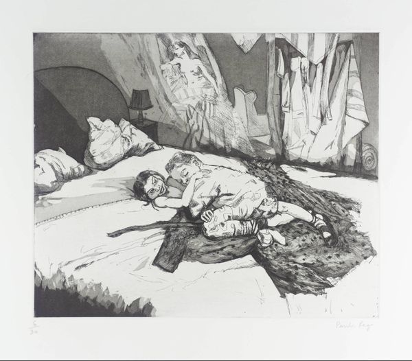 Curator: Edwin Austin Abbey, active between 1852 and 1911, created this compelling image. "Entrance of the Serving Maid," a narrative drawing, combines pen, ink, and charcoal. Editor: It’s got this somber, quiet mood about it, like you're peering into a very private moment. It reminds me a bit of those old black-and-white movies. Curator: Absolutely. Note how Abbey uses line work to define both shadow and form. The stark contrast emphasizes the spatial dynamics—a servant gazing towards a mistress or employer figure asleep in bed. What does this suggest to you? Editor: Well, it’s loaded, isn’t it? There's this power dynamic just hanging in the air, this tension of the have and have-not. The maid seems trapped in a watchful position. Does she feel sympathy or resentment, you wonder? It hits a nerve, makes you feel a little uncomfortable, yet compelled. Curator: It's difficult to ignore how genre painting of this period tends to highlight such class disparity and gendered labor. The maid's 'entrance' isn't just physical; it also suggests an intrusion on a private, privileged world, doesn't it? Her posture – head covering and all – speaks of her subjugated social role. Editor: You’re right. It’s more than just a scene; it's a statement. I keep thinking about how meticulously Abbey rendered the folds in her dress and yet how he also lets the linework blur together to cast shadows throughout the space. Is she frozen? Does she belong to this place? Is the boundary blurred or impenetrable? Curator: The etching quality amplifies this ambiguity; each stroke invites interpretation and speaks volumes about the unseen emotional realities of its time. This narrative encapsulates how labor and social stratification were understood, and often reinforced through art. Editor: Exactly. You start wondering about the untold stories within these silent black lines – the servant's life, dreams, and the intricate dance of daily domestic labor in the face of a more restful life nearby. I appreciate art that lingers long after you've turned away from it. Curator: And how art, as we continue to ask pertinent questions and reflect upon historical relationships, still manages to offer new insights into the power structures shaping today's society.