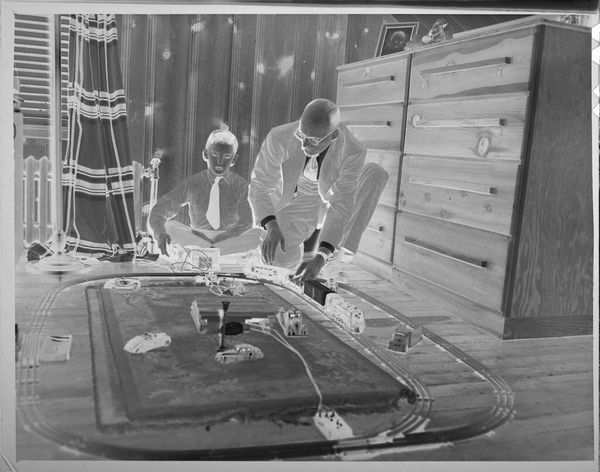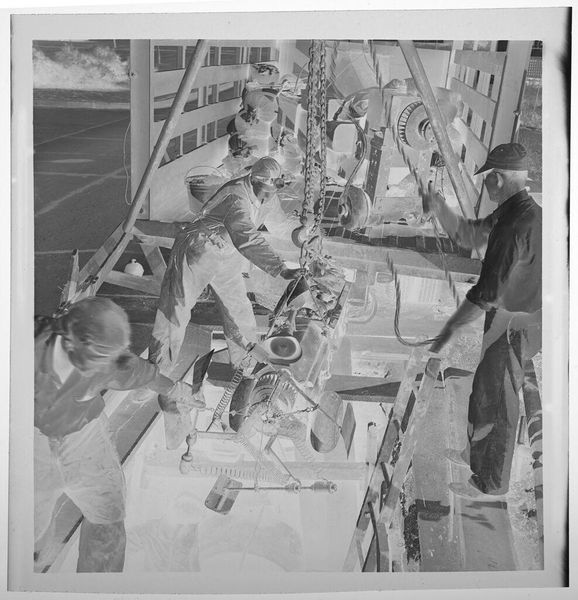 Curator: This photograph, by Harry Annas, is simply titled "Untitled (men working with carcasses in Kreuz meat market)." Editor: My first thought? Stark. The high contrast and the subject matter... it's unsettling but mesmerizing. Curator: It certainly captures a moment in the history of labor, doesn't it? The Kreuz meat market must have been a vital part of the community, and Annas gives us a glimpse into its gritty reality. Editor: It's more than just gritty, though. The way the light falls across the carcasses, the angle of the workers' bodies... it's almost a dance of life and death. Heavy stuff. Curator: I agree. Think about how images like this shape our understanding of the food industry, the working class, and even our own consumption habits. It's a far cry from the sanitized supermarket experience. Editor: Absolutely. It forces us to confront the source, the process. It's a reminder that what we eat has a story, often a difficult one. It stays with you. Curator: Indeed, it's a potent image that speaks volumes about a particular time and place, but also about universal themes. Editor: For me, it's a visceral experience—a conversation starter about where our meat comes from and what it takes to get it on our tables.