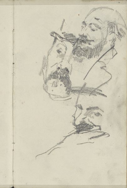 Curator: This sheet of sketches, called "Figuurstudies en paarden," or "Figure Studies and Horses," was rendered by George Hendrik Breitner between 1880 and 1882, during his early period. It's now part of the Rijksmuseum collection. What strikes you most about it? Editor: Its vulnerability. It feels like peeking into the artist's notebook, seeing thoughts take shape tentatively, like whispered secrets. The pencil strokes are so light, barely there, it's as if he's afraid to commit. Curator: Yes, exactly! You feel his searching, the restless energy as he captures these fleeting glimpses of figures and horses. What interests me particularly is how he approaches realism. It is, of course, the observation, the real… But the rough quality of the sketch adds a strange expressive depth, doesn’t it? Editor: Absolutely. This wasn't meant for public consumption, so we see a kind of working-class materiality stripped bare—literally, just paper and pencil. It begs the question, where did he source the materials? Did the paper’s texture influence the pressure of the pencil? It brings to mind Breitner's fascination with the everyday. Was sketching on readily available paper a conscious choice, an anti-academic stance even? Curator: That's fascinating. You are right, it challenges the hierarchy of materials, doesn’t it? The raw quality removes any artifice, giving us access to the artist’s unfiltered observation. Editor: I also notice how fragmented the images are—heads floating, horses incomplete. Were they based on specific models? Or just products of his memory or imagining? Curator: It’s thought that Breitner may not have actually directly used the image and horses portrayed. They served more as inspiration, as springboards for memory and emotions. But he really was about capturing a feeling or atmosphere rather than literal accuracy, wasn’t he. Editor: This raw immediacy does, strangely enough, enhance their realistic feeling. We see figures in formation, caught in moments before realization. There's a power in its seeming incompleteness, actually. Curator: Definitely, these are the bare bones of artistic thought, and in them, a potent kind of truth. Thanks for helping me consider Breitner's approach in this fresh light. Editor: My pleasure. It's been enlightening for me as well, looking beneath the surface of a drawing and seeing how basic resources such as paper can challenge our expectations of traditional artwork.