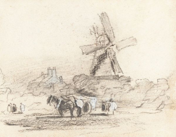 Curator: The work before us is entitled "Eye Mill in Suffolk," a pencil drawing by John Sell Cotman. Editor: There's an immediate feeling of quietude. The lone windmill sits high on a hill, seemingly still under a vast sky. It exudes an aura of simpler times. Curator: Cotman, as a key figure in the Norwich School of painters, often captured the spirit of the English countryside. His artistic endeavors highlight how a rapidly industrializing nation sought connection to the rural landscape through art and cultural symbols of its disappearing agrarian heritage. Editor: The windmill itself—beyond its practical function—takes on symbolic weight here, doesn’t it? Like a solitary guardian, representing enduring strength and labor against the relentless advance. Windmills are such powerful archetypes of steadfastness. Curator: Yes, precisely. It becomes an icon of traditional industry in a world of increasing modernization. Note how the placement on a hill reinforces a visual hierarchy where agrarian labor becomes sanctified through elevation. The sketch style softens any sense of harsh industrialization as well. Editor: Interesting observation. The way he has captured the light is exquisite—there are some bird figures in the sky and some animals on the hill-- all the details really bring life to an old technology that is on display here. The overall image gives it a nostalgic impression. Curator: I find myself wondering about the commission. Landscape depictions helped maintain public connections to rural industry at a time of urban migration. Art institutions of the period further codified landscape's "objective" importance, subtly reinforcing socio-economic relationships even through pastoral scenes. Editor: So, it’s about more than just the visual appeal; it's tied to larger cultural and political trends! Perhaps what feels nostalgic to me now was already tinged with a sense of looking back even then? Well, this has shifted how I initially perceived the piece significantly! Curator: Indeed! "Eye Mill in Suffolk" not only demonstrates Cotman's skillful draftsmanship but invites reflection on how artistic representations negotiate complex socio-political undercurrents. Editor: This exploration made visible the inherent paradox of romanticizing industries of a bygone era in art—beautiful in itself but deeply informed by the human experience and cultural memory. Thank you for your historical insights!