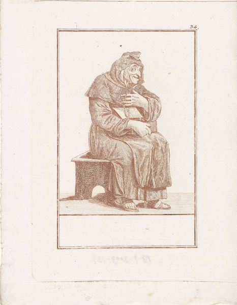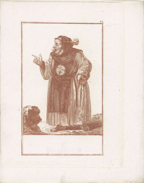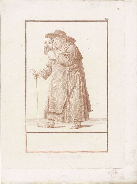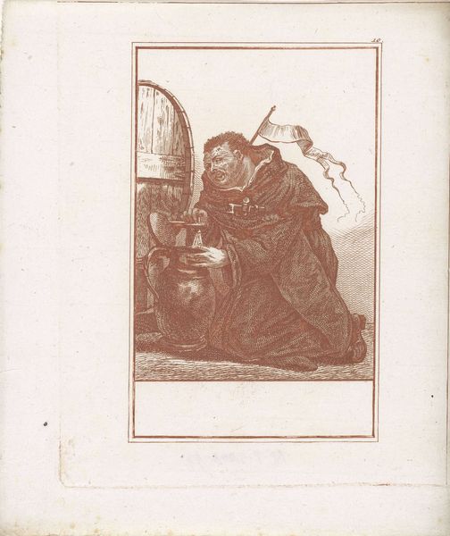 Curator: Jacob Gole's "Dikke monnik met mand met gevogelte," created around 1724, is a fascinating engraving, currently residing in the Rijksmuseum. It strikes me as darkly comic. Editor: Absolutely. The visual language—the corpulent figure, the overloaded basket, the gluttonous act of consuming a bird—reads as a blatant emblem of excess. How does the work function structurally? Curator: The composition centers the monk, almost square within the frame, establishing him as the dominant element. Notice the tonal gradations achieved through the density of lines, creating a rich sense of texture in the monk’s robes. This suggests an interest in capturing both form and surface quality through line work. Editor: Gole's caricature of the monk evokes potent associations. Monks were frequently lampooned for perceived hypocrisy or decadence during this era, and this image fits squarely into that critical tradition. The symbolic load is rather heavy; he seems weighed down by the earthly delights represented by all that poultry. Curator: I am intrigued by the formal relationship between the various elements – the curvature of the basket, the sharp angles of the dead birds, the circle on the monk's chest—and how these create a dynamic rhythm throughout the relatively confined picture plane. The circular medallion also bears formal resemblance to his rotund belly. Editor: The image's humor operates through recognizable visual shortcuts. This isn’t merely about satirizing the Church; it engages with broader anxieties about social roles, moral corruption, and indulgence. Look closely at the way his hat mirrors a crown – there is something almost kingly about the rendering. Curator: Certainly, and considering the socio-historical context of Baroque portraiture, this playful twisting of conventions offers compelling material for inquiry. I appreciate its graphic simplicity that manages to simultaneously ridicule and represent. Editor: It leaves you considering the continuity of certain symbols and prejudices over time and the way cultural narratives get constructed through visual rhetoric.