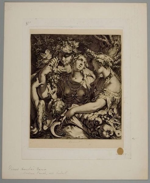 This image titled 'Bacchus, Ceres en Venus' was made by J. Kuyper as a print. It depicts Bacchus, Ceres and Venus, a trio of Greco-Roman deities, representing wine, agriculture, and love and beauty respectively. The image creates meaning through its references to classical mythology, a cultural touchstone in the Netherlands where it was made. Its symbolism, such as Bacchus’ grapes, Venus’ beauty and Ceres’ plentiful harvest, carries an allegorical message that reflects a particular cultural moment. The print may have served educational purposes, teaching viewers about classical mythology and its influence on Western culture. The availability and accessibility of prints also played a role in shaping art and culture. Historical research on the Dutch art market, the popularity of classical themes, and Kuyper’s body of work can contribute to the understanding of the socio-cultural context of this print. These sources help us view art not as isolated objects but as products of specific social and institutional conditions.