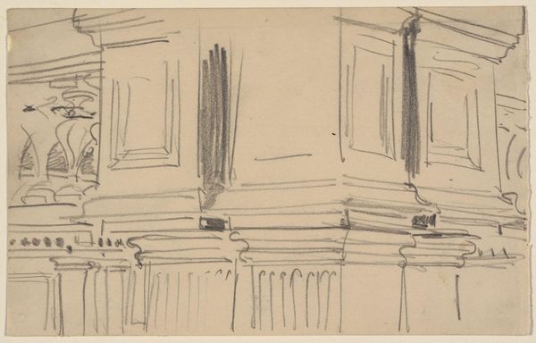 Curator: Let's turn our attention to this rapid ink sketch, *Study of a Balustrade*, by John Singer Sargent. Editor: There's a certain energy in the lines. It feels unfinished, raw—a glimpse into his process. Curator: Precisely. Note how Sargent uses the varying thicknesses of the ink lines to define form and space, manipulating light and shadow. Editor: I'm intrigued by the visible marks of his hand, the almost impulsive strokes. The materiality of the ink on paper communicates a sense of immediacy. Curator: Agreed. Sargent’s deliberate choices regarding composition create a dynamic tension, drawing the eye across the architecture. Editor: It's a study in contrasts, isn't it? Refined classical elements rendered with an almost brutal, certainly utilitarian, directness. Curator: An excellent point. Editor: It makes you wonder about the context of its creation, the purpose it served for Sargent beyond the aesthetic. Curator: Indeed, a piece that compels us to ponder the artist's methodology and the interplay between form and function. Editor: A worthwhile reminder to consider the labor inherent to even the most seemingly effortless artistic expressions.