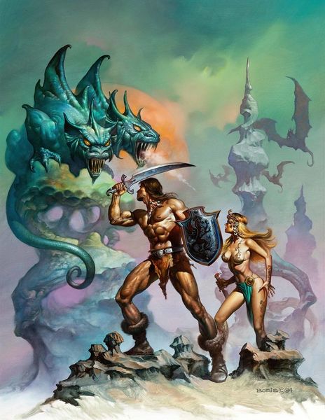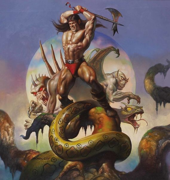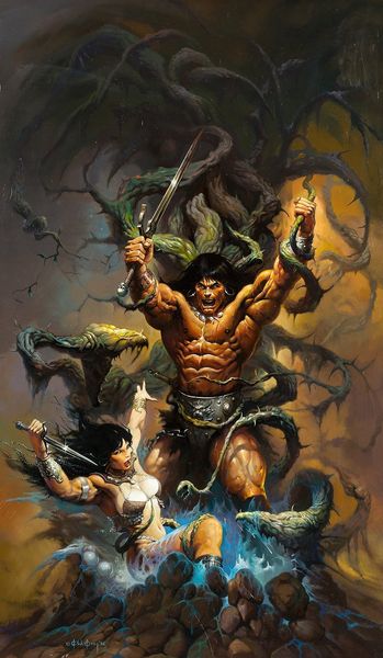 Editor: Ken Kelly’s "Conan," created in 1996 using acrylic paint, strikes me as incredibly dynamic. There's a raw, almost theatrical energy in the poses and the dramatic lighting. What do you see in this piece? Curator: Beyond the immediate fantasy tropes, this piece serves as an interesting commentary on power dynamics, particularly masculinity, within patriarchal structures. Consider the exaggerated musculature of Conan himself, positioned as dominant atop this creature. How does that affect your reading, given that many fantasy narratives, like this, were consumed by young men establishing their own self-image? Editor: So you're saying the painting could be seen as reinforcing certain ideals about how men should look and act? The woman is secondary. Curator: Exactly. Note how her vulnerability, her relative lack of agency in this tableau, positions Conan as the active agent. Also consider the role of fantasy, historically and currently. Whose fantasies are validated? Whose are marginalized? The painting, viewed through a contemporary lens, invites us to examine the ideological underpinnings of this visual language. Editor: That's really interesting. I hadn’t considered the role the female figure plays beyond just someone in need of saving. I was caught up in the visual spectacle. Curator: And that spectacle itself deserves analysis! The painterly style and action-painting aesthetic, which conveys dynamism and brutality, also glorifies violent strength, echoing themes often associated with conquest. Editor: Thinking about those power dynamics definitely shifts how I understand it. I see it now as much more than just a cool fantasy image. Curator: Right. Hopefully, thinking critically can unveil so much about societal power structures from a painting! Editor: This makes me appreciate art even more – as something deeply woven into our society and history.