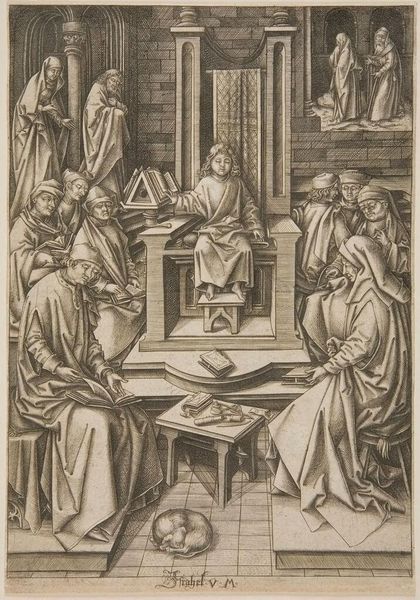 Editor: So this is Israhel van Meckenem the younger's "The Mass of Saint Gregory," an engraving. It feels incredibly detailed, but also quite...stark. What draws your eye when you look at this print? Curator: Well, the sheer density of imagery is captivating. Imagine the artist, hunched over a plate, meticulously carving each line! Notice how the scene unfolds almost like a stage play, but with a twist of the surreal. What do you make of the figure of Christ hovering above the altar? Editor: It's...unexpected! Almost like a vision. Curator: Exactly! Van Meckenem masterfully blends the earthly with the divine. It’s like a window into a very particular, late medieval, mind. It makes you wonder, doesn't it, what else lies hidden in plain sight? Editor: It does. I definitely have a better understanding now.