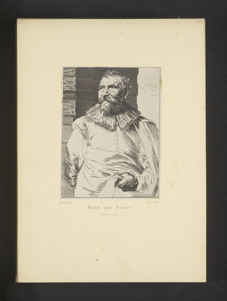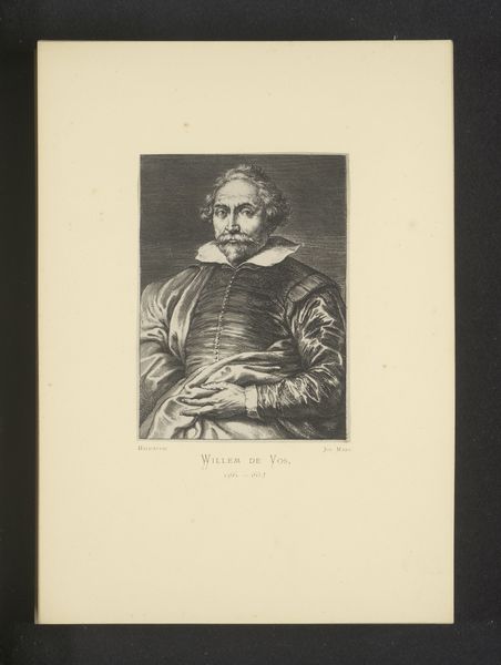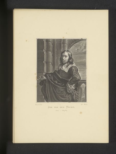 Editor: Here we have a reproduction of an engraving of a portrait of Deodat van der Mont by Lucas Vorsterman. The print is estimated to be from before 1877. It feels very formal and posed, a glimpse into another time. What sort of symbolic meanings do you find in this image? Curator: Well, consider the ruff collar. It’s not just fashion; it’s a statement. A visual barrier, literally distancing the subject, Deodat van der Mont, from the viewer. It speaks of status, sure, but also of a controlled identity, presented to the world under very specific terms. Editor: So it's like a visual code for “important person, approach with caution”? Curator: Precisely. And the chain with the pendant? Another layer. Objects carried on the body signify power. Think of how portraits use clothing or objects, often pointing back to historical references, almost like spells woven to transmit continuity. What sort of lineage did Deodat hope to perpetuate? Editor: I hadn't thought of clothing that way. Is the architectural setting significant, too? It’s a bit austere. Curator: Absolutely. The stone blocks evoke permanence, stability, maybe even a hint of classical virtue. He's literally building his image upon these established ideas, isn't he? It speaks volumes about how Deodat, or perhaps Vorsterman himself, wanted to be perceived, connecting himself to lasting and solid principles. It suggests more than just wealth; it implies an enduring legacy. Editor: So every element carefully constructed…it gives a new weight to historical portraiture. Thanks, that makes me think differently about these types of artworks now. Curator: My pleasure. It is in these subtleties that the cultural echoes truly resonate.