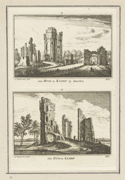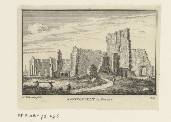 Abraham Rademaker created this print titled "Gezicht op de ruïne van het klooster Koningsveld" in 1573, now held at the Rijksmuseum. The delicate lines of the engraving capture the somber scene of the Koningsveld monastery ruins. Light plays across the broken walls, creating a textural contrast that evokes a sense of decay and historical weight. Rademaker uses a formal structure that invites us to reflect on the passage of time and the impermanence of human creation. The detailed rendering of the ruined architecture, set against a lightly sketched sky, emphasizes the dichotomy between human ambition and nature's indifference. The composition uses the ruins as semiotic markers, speaking to broader themes of loss, memory, and the cyclical nature of history. Note how the meticulous lines function not just aesthetically but as a commentary on the philosophical concerns of the era. The print serves as a meditation on the shifting boundaries between past and present, challenging fixed notions of cultural continuity.