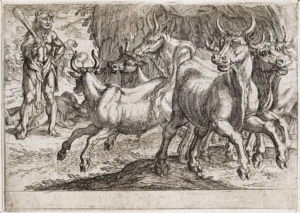 Editor: We're looking at "Hercules and the Oxen of Geryones," an etching by Antonio Tempesta, dating back to 1608. There's something about the chaos of the oxen juxtaposed with Hercules' stoic pose that's really striking. What do you make of it? Curator: Oh, I love the dynamic energy Tempesta captures! He’s just having fun with line, isn't he? Imagine the story unfolding - Hercules, muscles rippling, versus a stampede of scared oxen. It feels… almost playful despite the serious subject matter, wouldn't you say? What does that club tell you? Is it really necessary, or is it for show? Editor: I see what you mean about playful. The lines really give the oxen a sense of frantic motion. But, thinking about the history, this is one of Hercules' labors, right? Does the Baroque style add a layer to understanding the task's significance? Curator: Absolutely! Baroque is all about drama and heightened emotion. Look at the landscape, even; it's not a serene backdrop but part of the action, amplifying the tension. He's not just stealing some cows; he's wrestling with fate itself! You get a sense of that grandiose scale? Do you think it communicates effectively to a modern viewer? Editor: I do, especially knowing the story beforehand. Without it, it might just seem like… an angry man and some startled cows! Curator: Precisely! Art unlocks other worlds when the knowledge is layered, eh? Thanks, that clarified how the uninitiated eye might struggle with it. Editor: I didn't think about it that way. I love this art form of a single line which, at one time, could tell such engaging and fascinating narratives!