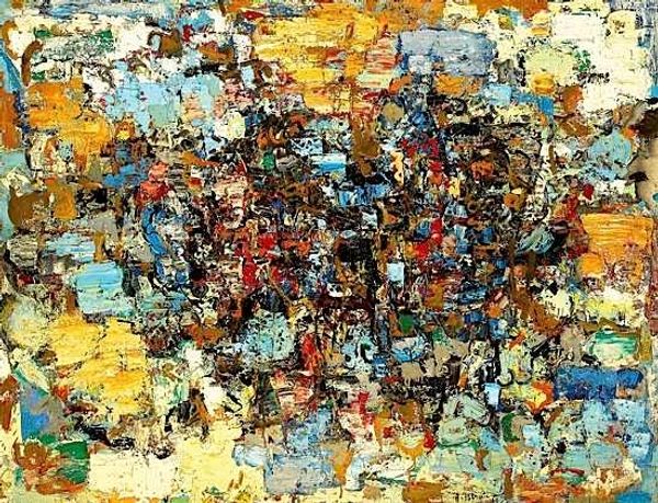 Editor: This is Natalia Dumitresco’s "Composition" from 1957, done in acrylic paint. It has an interesting scattered, almost frantic energy. What do you see in this piece, from a broader perspective? Curator: I see this painting as a product of its time, a fascinating artifact of post-war anxieties filtered through the lens of Abstract Expressionism. How does this chaotic energy play into the larger narrative of Europe navigating rebuilding and redefining itself? Editor: That’s an interesting point. I was mainly responding to the colours and shapes but I see how you're situating it historically. Do you think its abstraction removes it from reflecting those anxieties directly, or does it act as a kind of emotional translation? Curator: I think abstraction allowed artists to explore feelings and psychological states without resorting to overt representation. Dumitresco, a woman artist working in a male-dominated field, might have used abstraction as a space to negotiate her own experiences and perspective. Do you see any echoes of this gendered aspect when you consider the gestures or composition? Editor: I hadn't really considered it, but now that you mention it, there's a certain delicate intricacy within all the apparent chaos, maybe even a resilience in the face of the pressures of the era and art world! Curator: Exactly! Considering this painting, its non-objective presentation, and its history may suggest ways that Dumitresco constructed her own visual language and staked claim in a historical period defined by major political shifts. Editor: This has totally transformed how I look at the painting. It’s much more than just a composition of colors and shapes. Curator: Indeed. Hopefully, this dialogue can open up new paths and ways of observing how art reflects the society surrounding its creation!