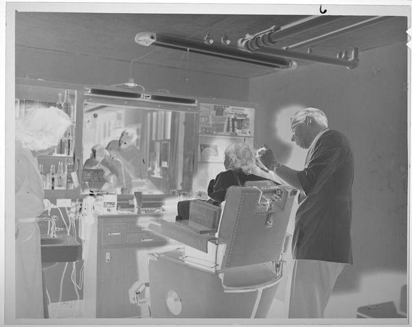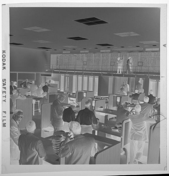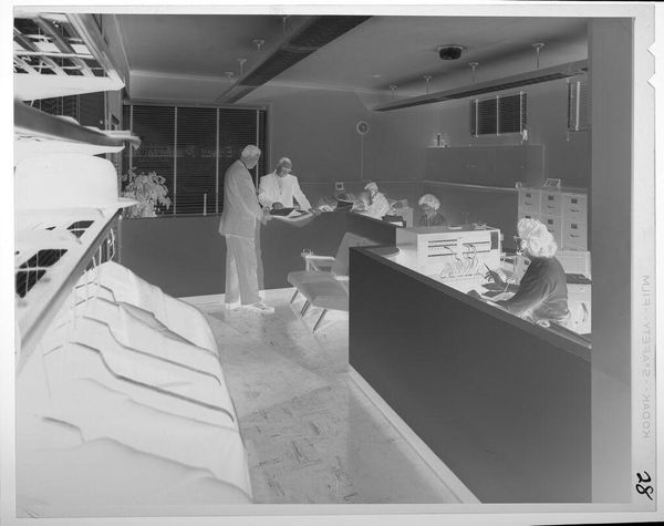 Curator: What strikes me about this gelatin silver print by Jack Gould is its stark, almost clinical atmosphere. Editor: Indeed. The image depicts what appears to be a laboratory setting, with figures meticulously working, surrounded by vessels and equipment. It's a scene of intense labor and precision. The Kodak safety film markings along the edge tell us something about the technology and means of production. Curator: Exactly, and the symbols! The uniforms and headwear denote a professional identity and perhaps even a sense of ritual. One is reminded of early scientific endeavors, where image-making and healing were intertwined with a certain mystique. Editor: It also speaks to a moment in history when scientific labor was undergoing rapid transformation, becoming increasingly standardized, and relying on industrial materials like this photographic film. Curator: In contemplating this photograph, I wonder about the cultural narrative embedded in this space—the shared history of medicine, scientific progress, and human intervention. Editor: And I am left considering the labor involved in producing both the objects within the scene and the photograph itself. It’s a fascinating intersection.