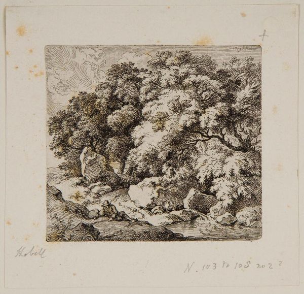 Curator: This etching is by Ferdinand Kobell, a German artist active in the late 18th century. It's called "Peasant Sitting on the Shore." Editor: The density of the foliage contrasted with the placid water certainly creates a feeling of serene isolation. Curator: Observe how the peasant, a recurring figure, embodies a connection to nature, suggesting a harmony lost in urban life. Editor: Yes, but look at the technique. The artist’s mark-making generates complex textures using only line; it's a study of tonal variation within a limited palette. Curator: The shore itself is a boundary, marking a liminal space where inner reflection meets the world, a visual metaphor perhaps? Editor: Possibly, but the composition, with its receding perspective, invites the eye to wander and simply appreciate the artistry. Curator: Ultimately, it is a poignant image reminding us of simpler times. Editor: Agreed. There is much to contemplate in its formal qualities alone.