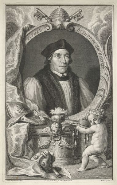 Editor: Here we have Jacob Houbraken's 1737 engraving, "Portret van Thomas Cromwell," from the Rijksmuseum. I'm immediately drawn to the detailed frame around the portrait, which features what seems to be a vignette from Cromwell’s life. It's fascinating! What stories do you think this piece is trying to tell? Curator: This isn’t just a portrait; it's an encoding of historical memory. Notice the vignette you mentioned. Consider who is handing a miniature to Cromwell? It hints at a key moment, perhaps connected to Henry VIII's marriage prospects and all of Cromwell's political maneuverings. The objects surrounding Cromwell—swords, keys, books, and crowns—aren't mere decoration, either. What do you think those things could possibly symbolize, historically? Editor: Well, the swords obviously represent power and authority. The keys might symbolize access to knowledge or maybe political secrets. Books could stand for wisdom or education, but I am unsure of what sort of insight is being conveyed? Curator: Exactly. Power, secrets, knowledge… but on whose terms? This is a post-reformation depiction. So, think about the lasting impact of the reformation on concepts of political and religious authority, how England repositioned itself within a rapidly changing Europe. This portrait reminds viewers not only of the person but of an entire chapter of cultural upheaval and enduring memory. Notice how, through line and form, Cromwell's presence asserts dominance, while the embedded scenes create secondary narratives. Editor: So the image serves almost like a condensed historical textbook, reflecting not just an individual but also the shifting values and cultural memories of an era? Curator: Precisely. It reminds us that portraits are rarely just likenesses, but are meticulously constructed narratives steeped in symbols that speak across centuries. The engraving process itself reinforces how historical narratives and propaganda get constructed. The engraving's stark contrasts solidify him as this heroic character. Editor: That’s given me so much to think about in how we understand images and how they subtly teach history. I’ll certainly never look at a portrait the same way again! Curator: Indeed. Visuals communicate more than is visually represented, and, through decoding these narratives, we strengthen the memory of their role in culture.